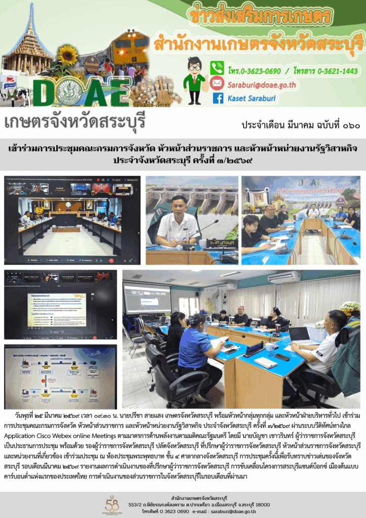 วันพุธที่ ๒๕ มีนาคม ๒๕๖๙ เวลา ๐๙.๓๐ น. นายปรีชา สายแสง เกษตรจังหวัดสระบุรี พร้อมหัวหน้ากลุ่มทุกกลุ่ม และหัวหน้าฝ่ายบริหารทั่วไป เข้าร่วมการประชุมคณะกรมการจังหวัด หัวหน้าส่วนราชการ และหัวหน้าหน่วยงานรัฐวิสาหกิจ ประจำจังหวัดสระบุรี ครั้งที่ ๓/๒๕๖๙ ผ่านระบบวีดิทัศน์ทางไกล Application Cisco Webex online Meetings ตามมาตรการด้านพลังงานตามมติคณะรัฐมนตรี โดยมี นายบัญชา เชาวรินทร์ ผู้ว่าราชการจังหวัดสระบุรี เป็นประธานการประชุม พร้อมด้วย รองผู้ว่าราชการจังหวัดสระบุรี ปลัดจังหวัดสระบุรี ที่ปรึกษาผู้ว่าราชการจังหวัดสระบุรี หัวหน้าส่วนราชการจังหวัดสระบุรี และหน่วยงานที่เกี่ยวข้อง เข้าร่วมประชุม ณ ห้องประชุมพระพุทธบาท ชั้น ๔ ศาลากลางจังหวัดสระบุรี การประชุมครั้งนี้เพื่อรับทราบข่าวเด่นของจังหวัดสระบุรี รอบเดือนมีนาคม ๒๕๖๙ รายงานผลการดำเนินงานของที่ปรึกษาผู้ว่าราชการจังหวัดสระบุรี การขับเคลื่อนโครงการสระบุรีแซนด์บ็อกซ์ เมืองต้นแบบคาร์บอนต่ำแห่งแรกของประเทศไทย การดำเนินงานของส่วนราชการในจังหวัดสระบุรีในรอบเดือนที่ผ่านมา