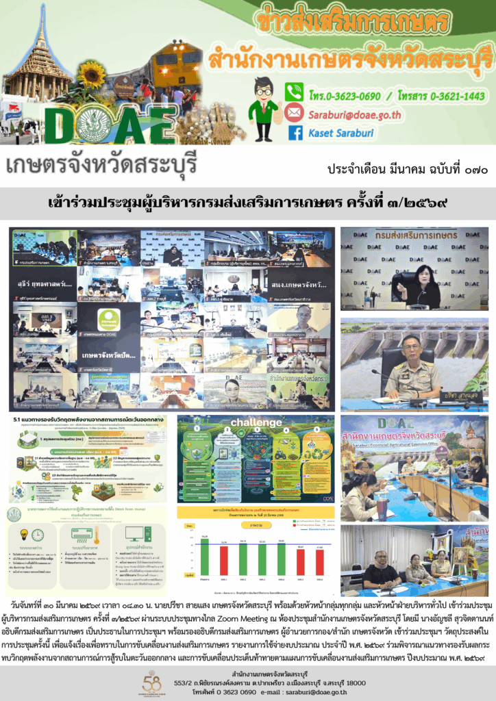 วันจันทร์ที่ ๓๐ มีนาคม ๒๕๖๙ เวาลา ๐๘.๓๐ น. นายปรีชา สายแสง เกษตรจังหวัดสระบุรี พร้อมด้วยหัวหน้ากลุ่มทุกกลุ่ม และหัวหน้าฝ่ายบริหารทั่วไป เข้าร่วมประชุม ผู้บริหารกรมส่งเสริมการเกษตร ครั้งที่ ๓/๒๕๖๙ ผ่านระบบประชุมทางไกล Zoom Meeting ณ ห้องประชุมสำนักงานเกษตรจังหวัดสระบุรี โดยมี นางอัญชลี สุวจิตตานนท์ อธิบดีกรมส่งเสริมการเกษตร เป็นประธานในการประชุมฯ วัตถุประสงค์ในการประชุมครั้งนี้ เพื่อแจ้งเรื่องเพื่อทราบในการขับเคลื่อนงานส่งเสริมการเกษตร รายงานการใช้จ่ายงบประมาณ ประจำปี พ.ศ. ๒๕๖๙ ร่วมพิจารณาแนวทางรองรับผลกระทบวิกฤตพลังงานจากสถานการณ์การสู้รบในตะวันออกกลาง และการขับเคลื่อนประเด็นท้าทายตามแผนการขับเคลื่อนงานส่งเสริมการเกษตร ประจำปีงบประมาณ พ.ศ. ๒๕๖๙