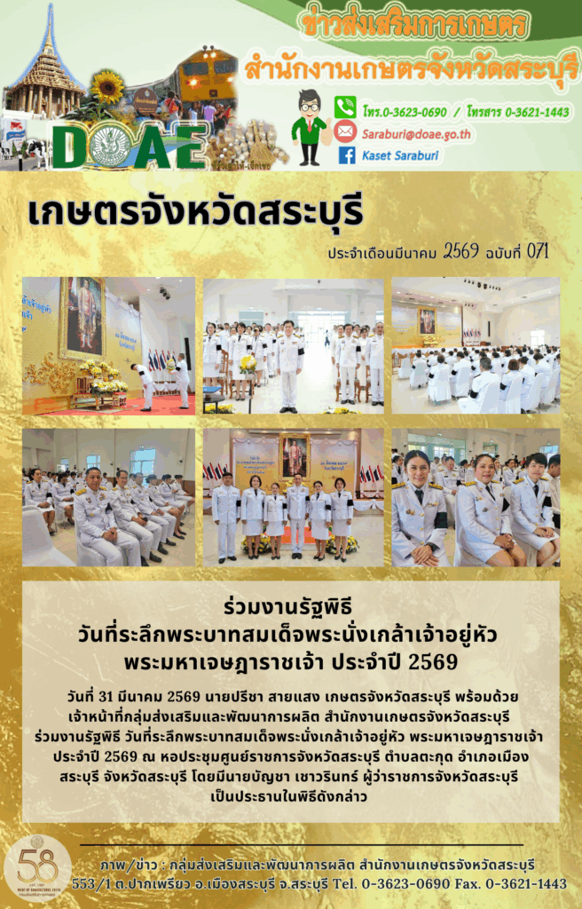 ร่วมงานรัฐพิธี วันที่ระลึกพระบาทสมเด็จพระนั่งเกล้าเจ้าอยู่หัว พระมหาเจษฎาราชเจ้า ประจำปี 2569 ณ หอประชุมศูนย์ราชการจังหวัดสระบุรี ตำบลตะกุด อำเภอเมืองสระบุรี จังหวัดสระบุรี โดยมีนายบัญชา เชาวรินทร์ ผู้ว่าราชการจังหวัดสระบุรี เป็นประธานในพิธีดังกล่าว