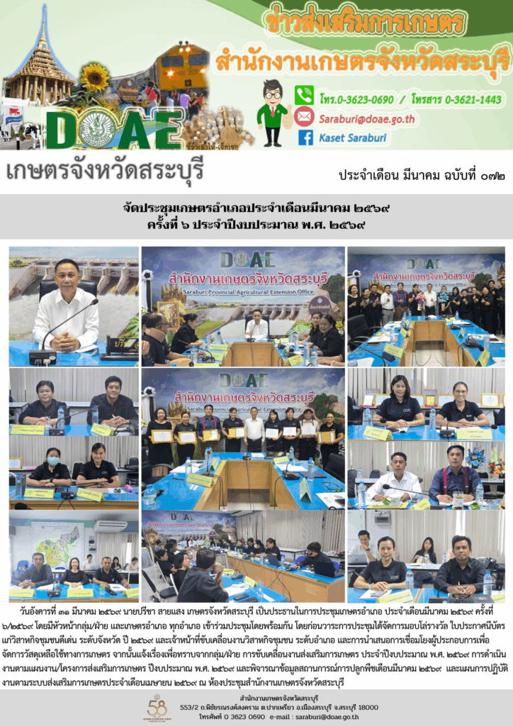 ครั้งที่ ๖ ประจำปีงบประมาณ พ.ศ. ๒๕๖วันอังคารที่ ๓๑ มีนาคม ๒๕๖๙ นายปรีชา สายแสง เกษตรจังหวัดสระบุรี เป็นประธานในการประชุมเกษตรอำเภอ ประจำเดือนมีนาคม ๒๕๖๙ ครั้งที่ ๖/๒๕๖๙ โดยมีหัวหน้ากลุ่ม/ฝ่าย และเกษตรอำเภอ ทุกอำเภอ เข้าร่วมประชุมโดยพร้อมกัน โดยก่อนวาระการประชุมได้จัดการมอบโล่รางวัล ใบประกาศนีบัตรแก่วิสาหกิจชุมชนดีเด่น ระดับจังหวัด ปี ๒๕๖๙ และเจ้าหน้าที่ขับเคลื่อนงานวิสาหกิจชุมชน ระดับอำเภอ และการนำเสนอการเชื่อมโยงผู้ประกอบการเพื่อจัดการวัสดุเหลือใช้ทางการเกษตร จากนั้นแจ้งเรื่องเพื่อทราบจากกลุ่ม/ฝ่าย การขับเคลื่อนงานส่งเสริมการเกษตร ประจำปีงบประมาณ พ.ศ. ๒๕๖๙ การดำเนินงานตามแผนงาน/โครงการส่งเสริมการเกษตร ปีงบประมาณ พ.ศ. ๒๕๖๙ และพิจารณาข้อมูลสถานการณ์การปลูกพืชเดือนมีนาคม ๒๕๖๙ และแผนการปฏิบัติงานตามระบบส่งเสริมการเกษตรประจำเดือนเมษายน ๒๕๖๙ ณ ห้องประชุมสำนักงานเกษตรจังหวัดสระบุรี