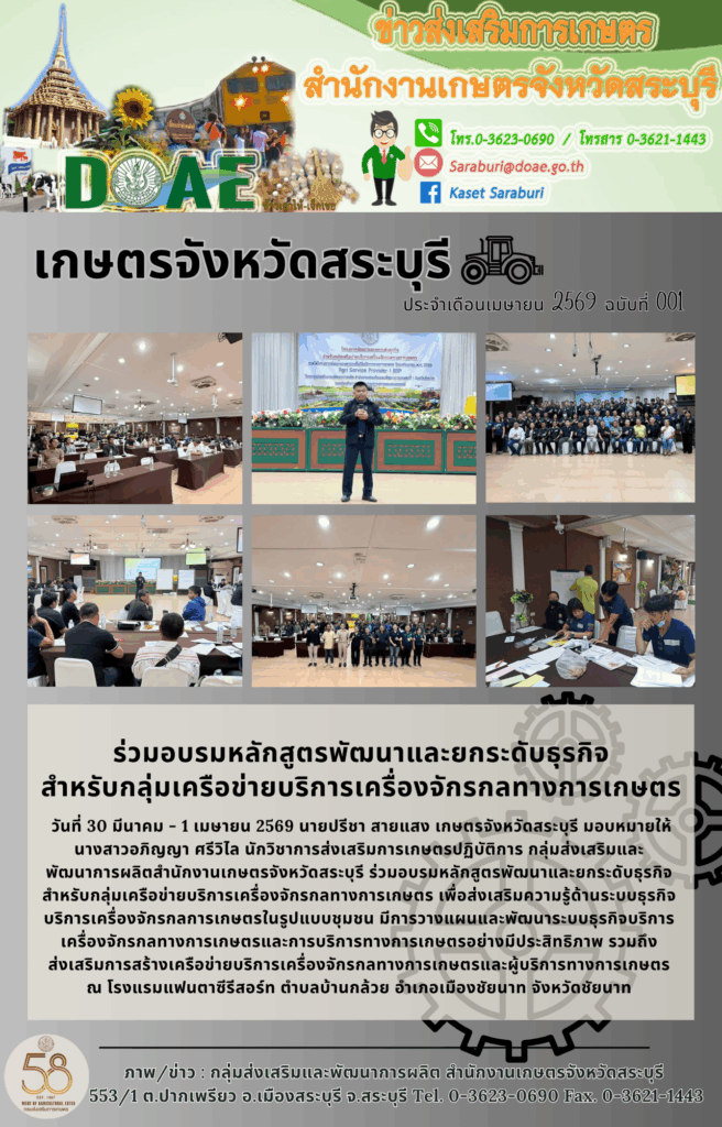 วันที่ 30 มีนาคม – 1 เมษายน 2569 นายปรีชา สายแสง เกษตรจังหวัดสระบุรี มอบหมายให้นางสาวอภิญญา ศรีวิไล นักวิชาการส่งเสริมการเกษตรปฏิบัติการ กลุ่มส่งเสริมและพัฒนาการผลิตสำนักงานเกษตรจังหวัดสระบุรี ร่วมอบรมหลักสูตรพัฒนาและยกระดับธุรกิจสำหรับกลุ่มเครือข่ายบริการเครื่องจักรกลทางการเกษตร เพื่อส่งเสริมความรู้ด้านระบบธุรกิจบริการเครื่องจักรกลการเกษตรในรูปแบบชุมชน มีการวางแผนและพัฒนาระบบธุรกิจบริการเครื่องจักรกลทางการเกษตรและการบริการทางการเกษตรอย่างมีประสิทธิภาพ รวมถึงส่งเสริมการสร้างเครือข่ายบริการเครื่องจักรกลทางการเกษตรและผู้บริการทางการเกษตร ณ โรงแรมแฟนตาซีรีสอร์ท ตำบลบ้านกล้วย อำเภอเมืองชัยนาท จังหวัดชัยนา