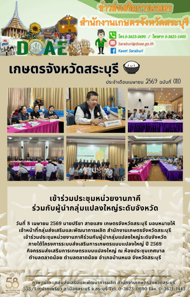 วันที่ 8 เมษายน 2569 นายปรีชา สายแสง เกษตรจังหวัดสระบุรี มอบหมายให้เจ้าหน้าที่กลุ่มส่งเสริมและพัฒนาการผลิต สำนักงานเกษตรจังหวัดสระบุรี เข้าร่วมประชุมหน่วยงานภาคีร่วมกับผู้นำกลุ่มแปลงใหญ่ระดับจังหวัด ภายใต้โครงการระบบส่งเสริมการเกษตรแบบแปลงใหญ่ ปี 2569 กิจกรรมส่งเสริมการเกษตรแบบแปลงใหญ่ ณ ห้องประชุมเทศบาล ตำบลตลาดน้อย ตำบลตลาดน้อย อำเภอบ้านหมอ จังหวัดสระบุรี