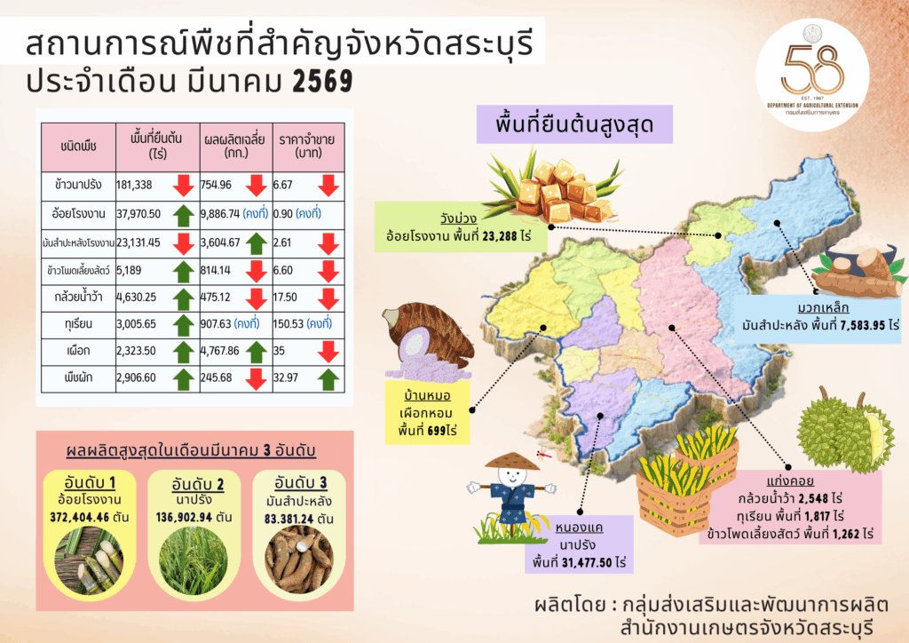 สถานการณ์พืชที่สำคัญ ของจังหวัดสระบุรี ประจำเดือนมีนาคม 2569By กลุ่มส่งเสริมและพัฒนาการผลิต / 10/04/2026