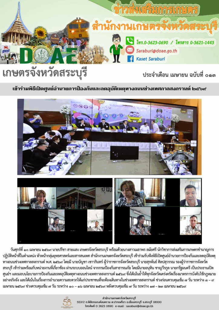 วันศุกร์ที่ ๑๐ เมษายน ๒๕๖๙ นายปรีชา สายแสง เกษตรจังหวัดสระบุรี พร้อมด้วยนางสาวเมธาพร ลมัยศรี นักวิชาการส่งเสริมการเกษตรชำนาญการ ปฏิบัติหน้าที่ในตำแหน่ง หัวหน้ากลุ่มยุทธศาสตร์และสารสนเทศ สำนักงานเกษตรจังหวัดสระบุรี เข้าร่วมรับฟังพิธีเปิดศูนย์อำนวยการป้องกันและลดอุบัติเหตุทางถนนช่วงเทศกาลสงกรานต์ พ.ศ. ๒๕๖๙ โดยมี นายบัญชา เชาวรินทร์ ผู้ว่าราชการจังหวัดสระบุรี นายสุรพันธ์ ศิลปสุวรรณ รองผู้ว่าราชการจังหวัดสระบุรี เข้าร่วมพร้อมกับหน่วยงานที่เกี่ยวข้อง ผ่านระบบออนไลน์ จากกรมป้องกันสาธารณภัย โดยมีนายอนุทิน ชาญวีรกูล นายกรัฐมนตรี เป็นประธานเปิดศูนย์ฯ และมอบนโยบายการป้องกันและลดอุบัติเหตุทางถนนช่วงเทศกาลสงกรานต์ ๒๕๖๙ ซึ่งได้เน้นย้ำให้ทุกจังหวัดเคร่งครัดเรื่องมาตรการบังคับใช้กฎหมายอย่างจริงจัง และได้เน้นในเรื่องการอำนวยความสะดวกให้แก่ประชาชนที่จะต้องเดินทางในช่วงเทศกาลสงกรานต์ ช่วงก่อนควบคุมเข้ม ๗ วัน ระหว่าง ๓ – ๙ เมษายน ๒๕๖๙ ช่วงควบคุมเข้ม ๗ วัน ระหว่าง ๑๐ – ๑๖ เมษายน ๒๕๖๙ หลังควบคุมเข้ม ๗ วัน ระหว่าง ๑๗ – ๒๓ เมษายน ๒๕๖๙