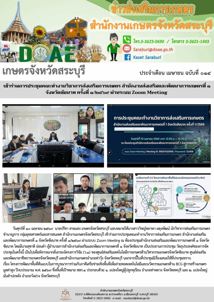 วันศุกร์ที่ ๑๐ เมษายน ๒๕๖๙ นายปรีชา สายแสง เกษตรจังหวัดสระบุรี มอบหมายให้นางสาววิชญ์ชยาพา ผดุงพัฒน์ นักวิชาการส่งเสริมการเกษตรชำนาญการ กลุ่มยุทธศาสตร์และสารสนเทศ สำนักงานเกษตรจังหวัดสระบุรี เข้าร่วมการประชุมคณะทำงานวิชาการส่งเสริมการเกษตร สำนักงานส่งเสริมและพัฒนาการเกษตรที่ ๑ จังหวัดชัยนาท ครั้งที่ ๑/๒๕๖๙ ผ่านระบบ Zoom Meeting ณ ห้องประชุมสำนักงานส่งเสริมและพัฒนาการเกษตรที่ ๑ จังหวัดชัยนาท โดยมีนายสุชาติ อ่อนดำ ผู้อำนวยการสำนักงานส่งเสริมและพัฒนาการเกษตรที่ ๑ จังหวัดชัยนาท เป็นประธานการประชุม วัตถุประสงค์ของการจัดประชุมในครั้งนี้ เป็นไปเพื่อพิจารณากลั่นกรองโครงการวิจัย (ว.๑) ของศูนย์ส่งเสริมเทคโนโลยีการเกษตรด้านวิศวกรรมเกษตรจังหวัดชัยนาท ศูนย์ส่งเสริมและพัฒนาอาชีพการเกษตรจังหวัดลพบุรี และสำนักงานเกษตรอำเภอท่าวุ้ง จังหวัดลพบุรี นอกจากนี้ในที่ประชุมมีเรื่องเสนอให้ที่ประชุมทราบ เรื่อง โครงการพัฒนาพื้นที่ต้นแบบในการบูรณาการร่วมกับภาคีเครือข่ายเชิงพื้นที่เพื่อถ่ายทอดเทคโนโลยีและนวัตกรรมเกษตรด้าน BCG สู่การสร้างเกษตรมูลค่าสูง ปีงบประมาณ พ.ศ. ๒๕๖๙ ซึ่งพื้นที่เป้าหมาย สสก.๑ ประกอบด้วย ๑. แปลงใหญ่ผู้ปลูกทุเรียน อำเภอท่าหลวง จังหวัดลพบุรี และ ๒. แปลงใหญ่มันสำปะหลัง อำเภอวังม่วง จังหวัดสระบุรี