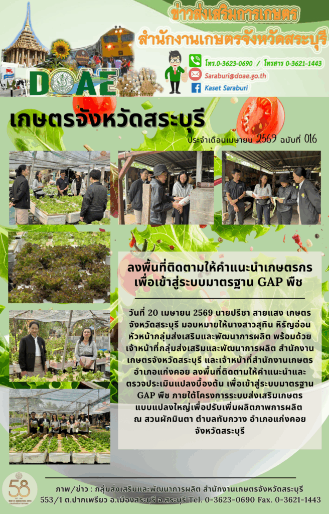 วันที่ 20 เมษายน 2569 นายปรีชา สายแสง เกษตรจังหวัดสระบุรี มอบหมายให้นางสาวสุทิน หิรัญอ่อน หัวหน้ากลุ่มส่งเสริมและพัฒนาการผลิต พร้อมด้วยเจ้าหน้าที่กลุ่มส่งเสริมและพัฒนาการผลิต สำนักงานเกษตรจังหวัดสระบุรี และเจ้าหน้าที่สำนักงานเกษตรอำเภอแก่งคอย ลงพื้นที่ติดตามให้คำแนะนำและตรวจประเมินแปลงเบื้องต้น เพื่อเข้าสู่ระบบมาตรฐาน GAP พืช ภายใต้โครงการระบบส่งเสริมเกษตรแบบแปลงใหญ่เพื่อปรับเพิ่มผลิตภาพการผลิต ณ สวนผักมินตา ตำบลทับกวาง อำเภอแก่งคอย จังหวัดสระบุรี