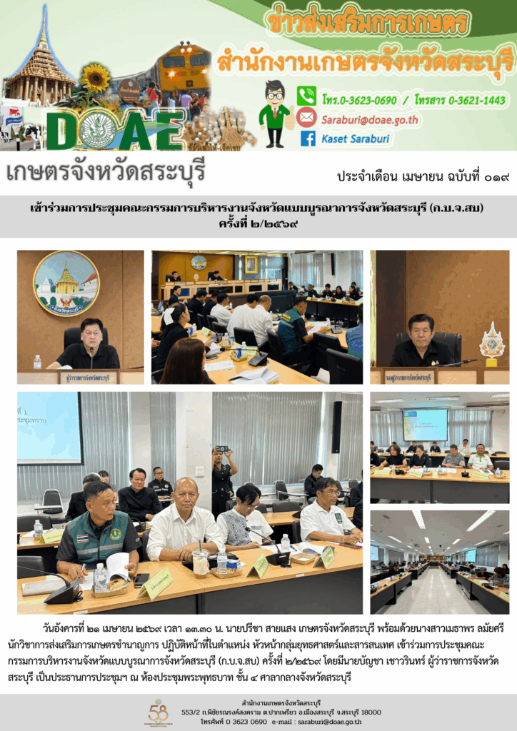 วันอังคารที่ 21 เมษายน 2569 เวลา 13.30 น. นายปรีชา สายแสง เกษตรจังหวัดสระบุรี พร้อมด้วยนางสาวเมธาพร ลมัยศรี นักวิชาการส่งเสริมการเกษตรชำนาญการ ปฏิบัติหน้าที่ในตำแหน่ง หัวหน้ากลุ่มยุทธศาสตร์และสารสนเทศ เข้าร่วมการประชุมคณะกรรมการบริหารงานจังหวัดแบบบูรณาการจังหวัดสระบุรี (ก.บ.จ.สบ) ครั้งที่ 2/2569 โดยมีนายบัญชา เชาวรินทร์ ผู้ว่าราชการจังหวัดสระบุรี เป็นประธานการประชุมฯ ณ ห้องประชุมพระพุทธบาท ชั้น 4 ศาลากลางจังหวัดสระบุรี