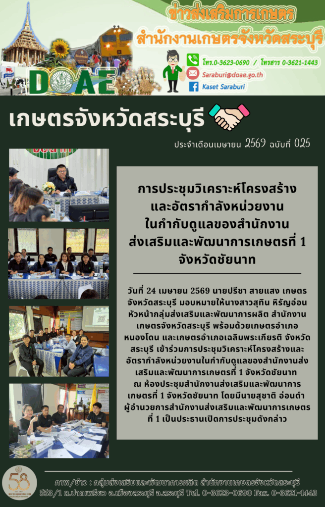 วันที่ 24 เมษายน 2569 นายปรีชา สายแสง เกษตรจังหวัดสระบุรี มอบหมายให้นางสาวสุทิน หิรัญอ่อน หัวหน้ากลุ่มส่งเสริมและพัฒนาการผลิต สำนักงานเกษตรจังหวัดสระบุรี พร้อมด้วยเกษตรอำเภอหนองโดน และเกษตรอำเภอเฉลิมพระเกียรติ จังหวัดสระบุรี เข้าร่วมการประชุมวิเคราะห์โครงสร้างและอัตรากำลังหน่วยงานในกำกับดูแลของสำนักงานส่งเสริมและพัฒนาการเกษตรที่ 1 จังหวัดชัยนาท ณ ห้องประชุมสำนักงานส่งเสริมและพัฒนาการเกษตรที่ 1 จังหวัดชัยนาท โดยมีนายสุชาติ อ่อนดำ ผู้อำนวยการสำนักงานส่งเสริมและพัฒนาการเกษตรที่ 1 เป็นประธานเปิดการประชุมดังกล่าว