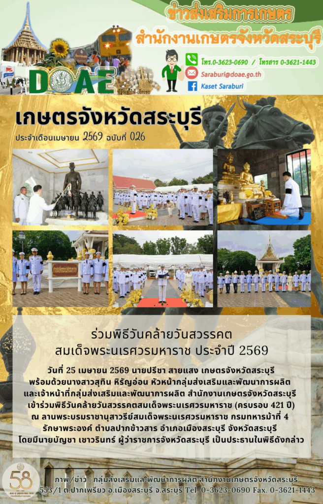 วันที่ 25 เมษายน 2569 นายปรีชา สายแสง เกษตรจังหวัดสระบุรี พร้อมด้วยนางสาวสุทิน หิรัญอ่อน หัวหน้ากลุ่มส่งเสริมและพัฒนาการผลิต และเจ้าหน้าที่กลุ่มส่งเสริมและพัฒนาการผลิต สำนักงานเกษตรจังหวัดสระบุรี เข้าร่วมพิธีวันคล้ายวันสวรรคตสมเด็จพระนเรศวรมหาราช (ครบรอบ 421 ปี) ณ ลานพระบรมราชานุสาวรีย์สมเด็จพระนเรศวรมหาราช กรมทหารม้าที่ 4 รักษาพระองค์ ตำบลปากข้าวสาร อำเภอเมืองสระบุรี จังหวัดสระบุรี โดยมีนายบัญชา เชาวรินทร์ ผู้ว่าราชการจังหวัดสระบุรี เป็นประธานในพิธีดังกล่าว