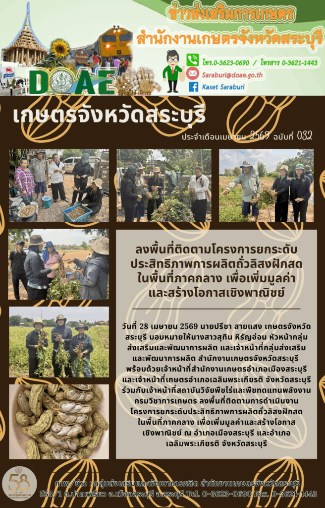 วันที่ 28 เมษายน 2569 นายปรีชา สายแสง เกษตรจังหวัดสระบุรี มอบหมายให้นางสาวสุทิน หิรัญอ่อน หัวหน้ากลุ่มส่งเสริมและพัฒนาการผลิต และเจ้าหน้าที่กลุ่มส่งเสริมและพัฒนาการผลิต สำนักงานเกษตรจังหวัดสระบุรี พร้อมด้วยเจ้าหน้าที่สำนักงานเกษตรอำเภอเมืองสระบุรี และเจ้าหน้าที่เกษตรอำเภอเฉลิมพระเกียรติ จังหวัดสระบุรี ร่วมกับเจ้าหน้าที่สถาบันวิจัยพืชไร่และพืชทดแทนพลังงาน กรมวิชาการเกษตร ลงพื้นที่ติดตามการดำเนินงานโครงการยกระดับประสิทธิภาพการผลิตถั่วลิสงฝักสดในพื้นที่ภาคกลาง เพื่อเพิ่มมูลค่าและสร้างโอกาสเชิงพาณิชย์ ณ อำเภอเมืองสระบุรี และอำเภอเฉลิมพระเกียรติ จังหวัดสระบุรี