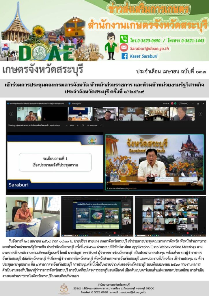 วันอังคารที่ ๒๘ เมษายน ๒๕๖๙ เวลา ๐๙.๓๐ น. นายปรีชา สายแสง เกษตรจังหวัดสระบุรี เข้าร่วมการประชุมคณะกรมการจังหวัด หัวหน้าส่วนราชการ และหัวหน้าหน่วยงานรัฐวิสาหกิจ ประจำจังหวัดสระบุรี ครั้งที่ ๔/๒๕๖๙ ผ่านระบบวีดิทัศน์ทางไกล Application Cisco Webex online Meetings ตามมาตรการด้านพลังงานตามมติคณะรัฐมนตรี โดยมี นายบัญชา เชาวรินทร์ ผู้ว่าราชการจังหวัดสระบุรี เป็นประธานการประชุม พร้อมด้วย รองผู้ว่าราชการจังหวัดสระบุรี ปลัดจังหวัดสระบุรี ที่ปรึกษาผู้ว่าราชการจังหวัดสระบุรี หัวหน้าส่วนราชการจังหวัดสระบุรี และหน่วยงานที่เกี่ยวข้อง เข้าร่วมประชุม ณ ห้องประชุมพระพุทธบาท ชั้น ๔ ศาลากลางจังหวัดสระบุรี การประชุมครั้งนี้เพื่อรับทราบข่าวเด่นของจังหวัดสระบุรี รอบเดือนเมษายน ๒๕๖๙ รายงานผลการดำเนินงานของที่ปรึกษาผู้ว่าราชการจังหวัดสระบุรี การขับเคลื่อนโครงการสระบุรีแซนด์บ็อกซ์ เมืองต้นแบบคาร์บอนต่ำแห่งแรกของประเทศไทย การดำเนินงานของส่วนราชการในจังหวัดสระบุรีในรอบเดือนที่ผ่านมา