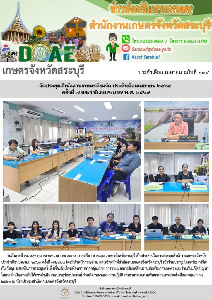 วันอังคารที่ ๒๘ เมษายน ๒๕๖๙ เวลา ๑๓.๓๐ น. นายปรีชา สายแสง เกษตรจังหวัดสระบุรี เป็นประธานในการประชุมสำนักงานเกษตรจังหวัด ประจำเดือนเมษายน ๒๕๖๙ ครั้งที่ ๗/๒๕๖๙ โดยมีหัวหน้ากลุ่ม/ฝ่าย และเจ้าหน้าที่สำนักงานเกษตรจังหวัดสระบุรี เข้าร่วมประชุมโดยพร้อมเพรียงกัน วัตถุประสงค์ในการประชุมครั้งนี้ เพื่อแจ้งเรื่องเพื่อทราบจากกลุ่ม/ฝ่าย การวางแผนการขับเคลื่อนงานส่งเสริมการเกษตร และร่วมกันแก้ไขปัญหาในการดำเนินงานเพื่อให้การดำเนินงานบรรลุวัตถุประสงค์ ร่วมพิจารณาแผนการปฏิบัติงานตามระบบส่งเสริมการเกษตรประจำเดือนเพฤษภาคม ๒๕๖๙ ณ ห้องประชุมสำนักงานเกษตรจังหวัดสระบุรี