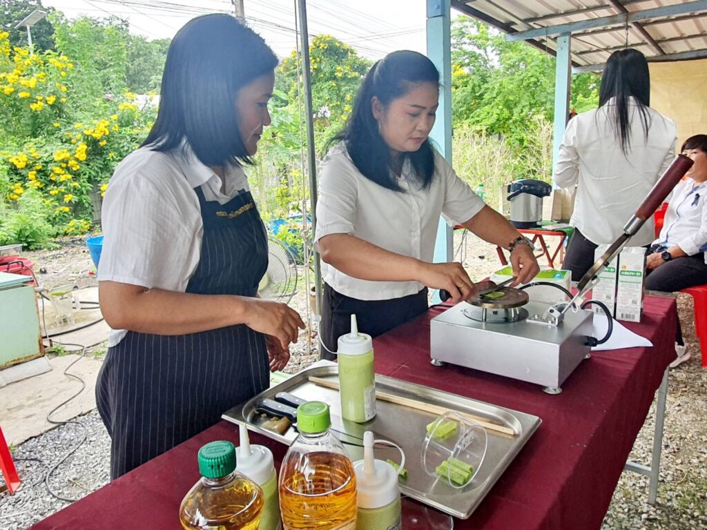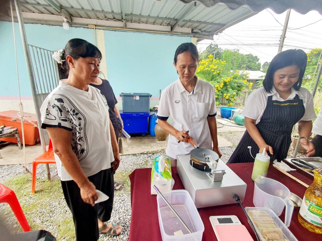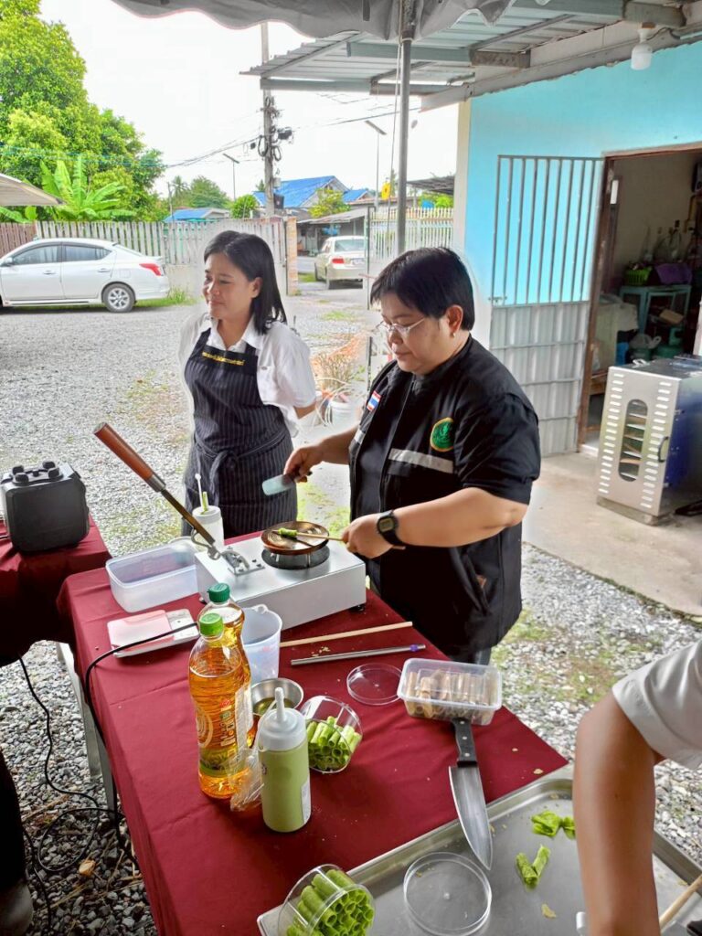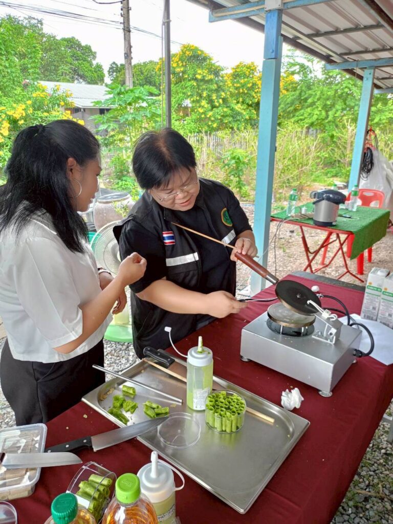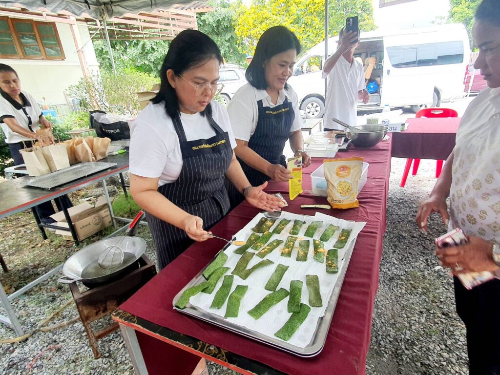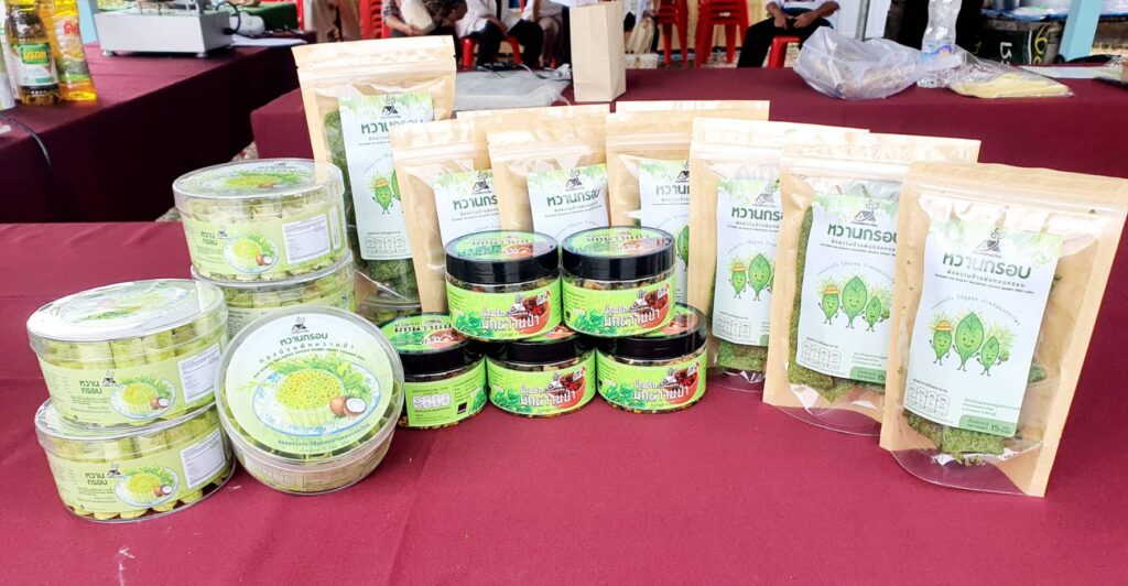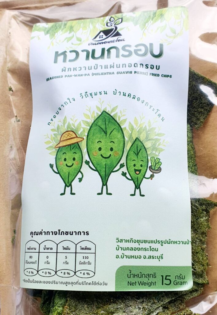 โอกาสนี้ คณาจารย์ได้สาธิตวิธีและให้สมาชิกวิสาหกิจชุมชนฯ ได้ร่วมกันทดลองทำผักหวานป่าแผ่นทอดกรอบปรุงรส และทองม้วนผักหวานป่า เพื่อสร้างมูลค่าเพิ่มภายใต้แบรนด์สินค้า “หวานกรอบ” รวมทั้งถ่ายทอดองค์ความรู้เรื่องการคิดต้นทุนราคาสินค้า การเขียน Story Telling ที่มาของสินค้า รวมทั้งการจำหน่ายสินค้าผ่านช่องทางออนไลน์ต่าง ๆ นอกจากนี้ ยังได้ให้การสนับสนุนอุปกรณ์ ได้แก่ เตาอบ เครื่องทำทองม้วน และบรรจุภัณฑ์พร้อมฉลากสินค้าให้กับทางกลุ่ม รวมทั้งเตรียมพัฒนาผลิตภัณฑ์ใหม่ ๆ ให้ตรงตามความต้องการของวิสาหกิจชุมชน เพื่อยกระดับและสร้างรายได้ให้กับชุมชนต่อไป