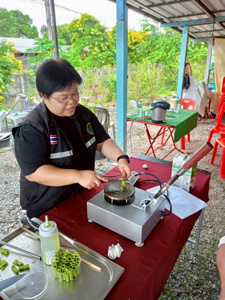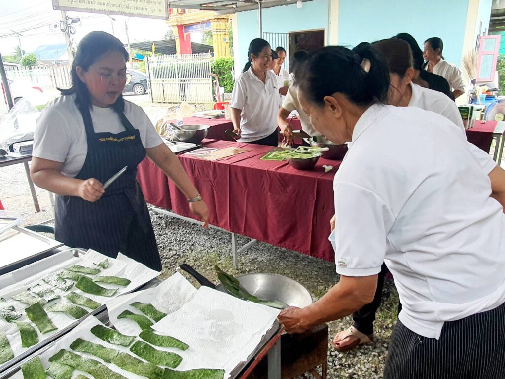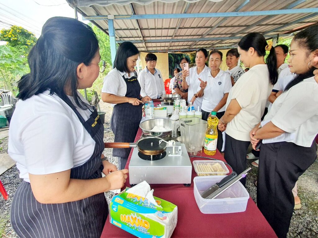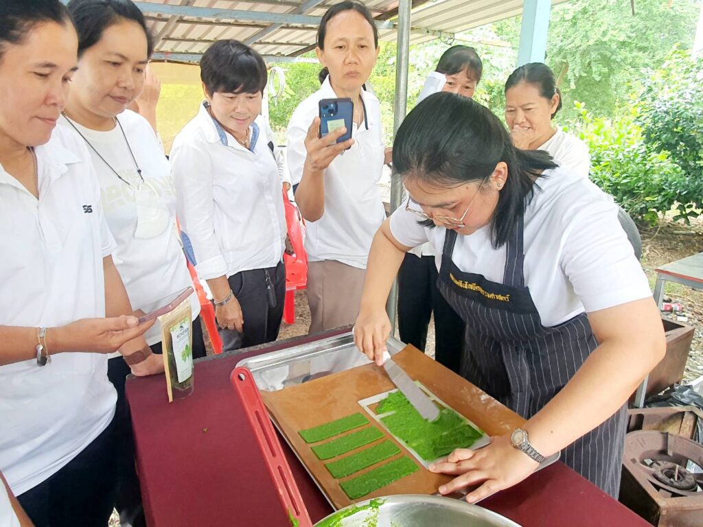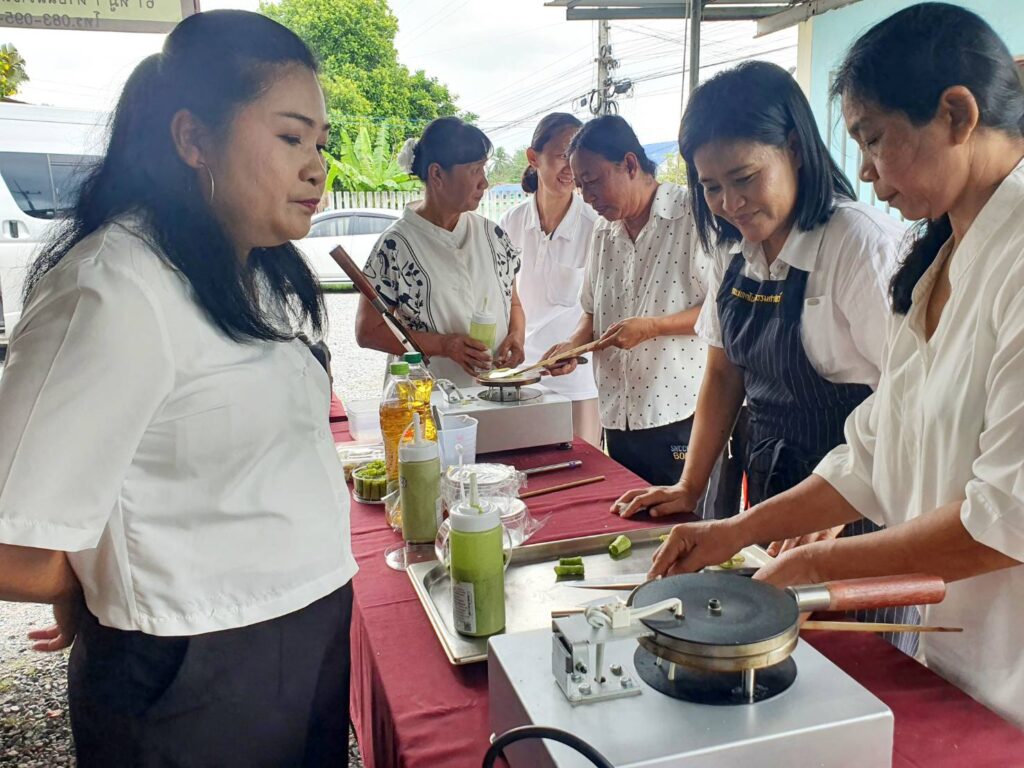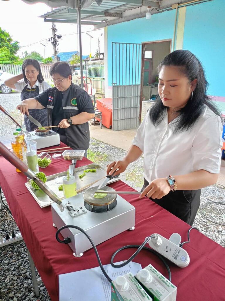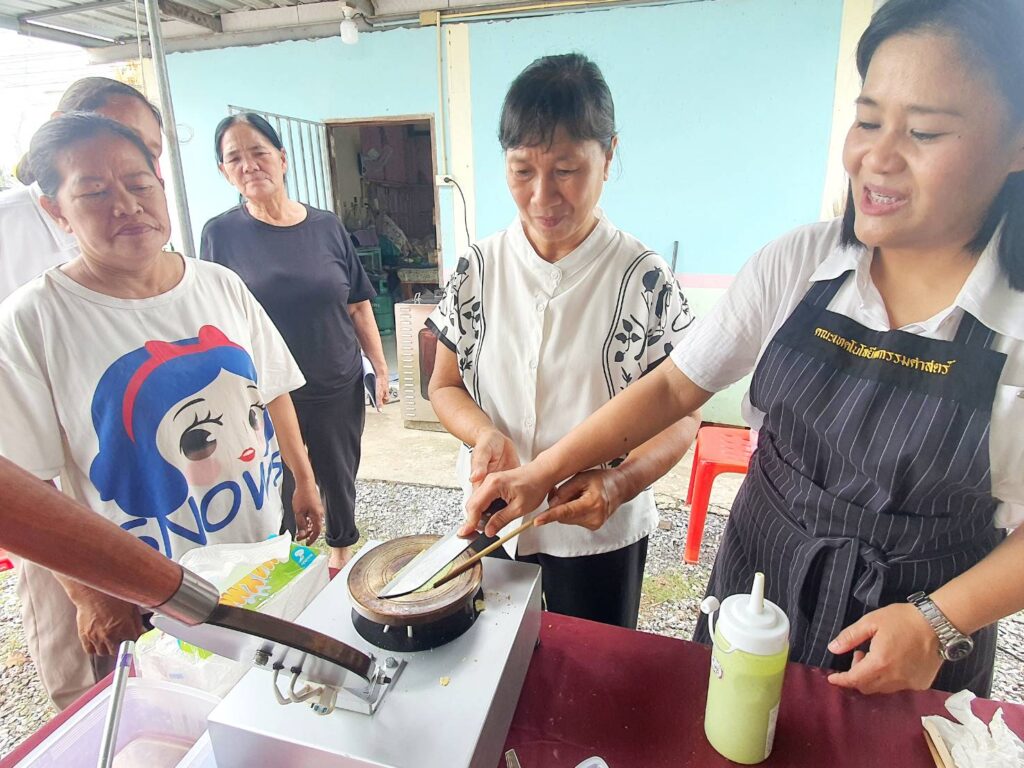 โอกาสนี้ คณาจารย์ได้สาธิตวิธีและให้สมาชิกวิสาหกิจชุมชนฯ ได้ร่วมกันทดลองทำผักหวานป่าแผ่นทอดกรอบปรุงรส และทองม้วนผักหวานป่า เพื่อสร้างมูลค่าเพิ่มภายใต้แบรนด์สินค้า “หวานกรอบ” รวมทั้งถ่ายทอดองค์ความรู้เรื่องการคิดต้นทุนราคาสินค้า การเขียน Story Telling ที่มาของสินค้า รวมทั้งการจำหน่ายสินค้าผ่านช่องทางออนไลน์ต่าง ๆ นอกจากนี้ ยังได้ให้การสนับสนุนอุปกรณ์ ได้แก่ เตาอบ เครื่องทำทองม้วน และบรรจุภัณฑ์พร้อมฉลากสินค้าให้กับทางกลุ่ม รวมทั้งเตรียมพัฒนาผลิตภัณฑ์ใหม่ ๆ ให้ตรงตามความต้องการของวิสาหกิจชุมชน เพื่อยกระดับและสร้างรายได้ให้กับชุมชนต่อไป