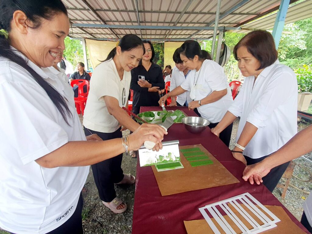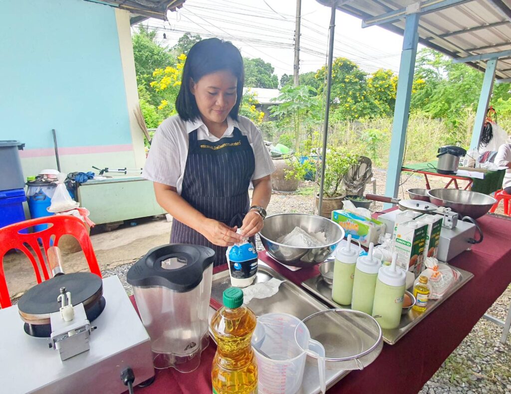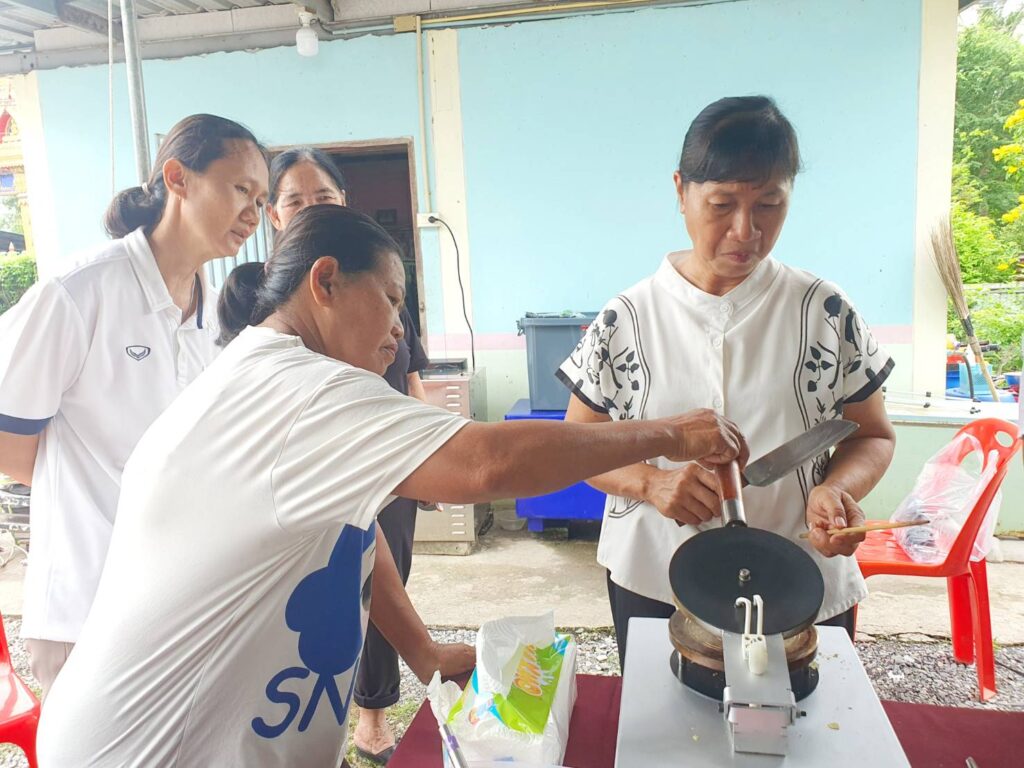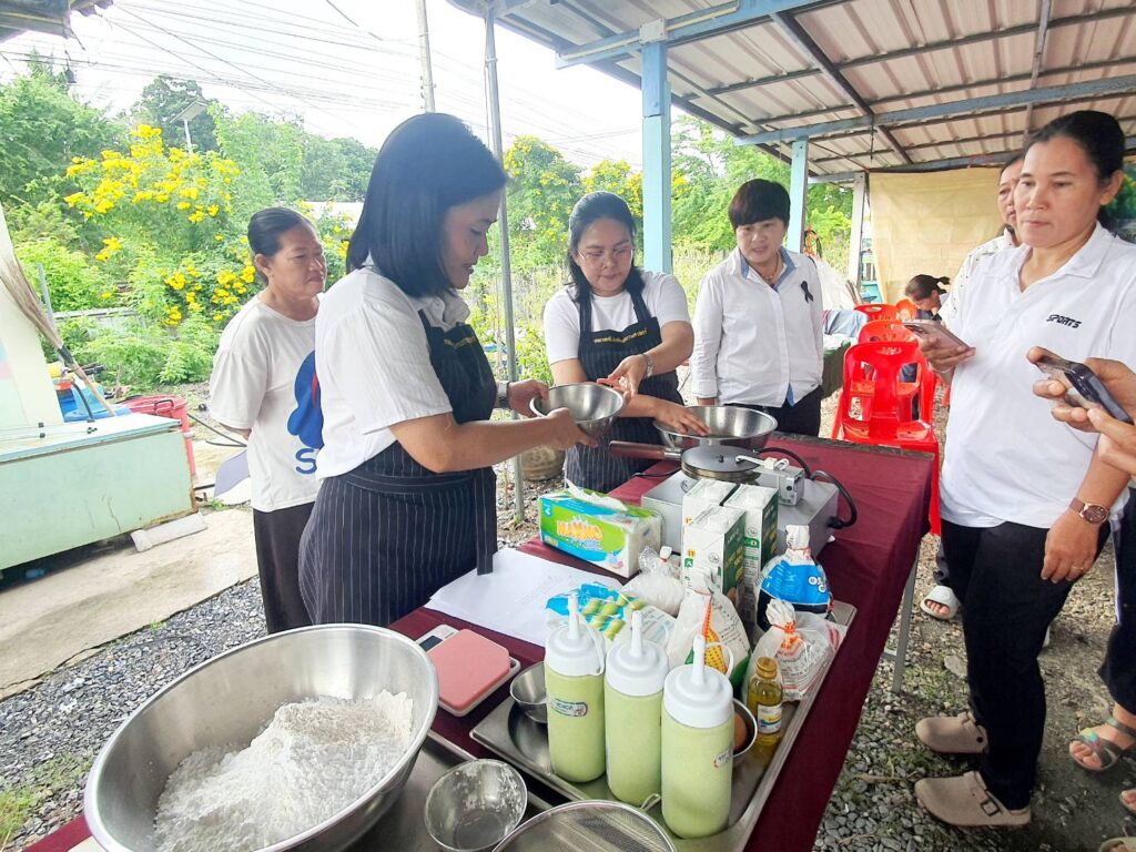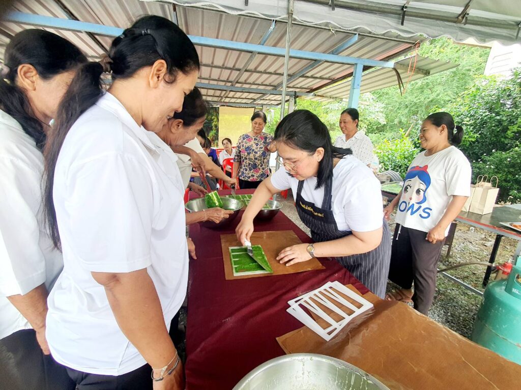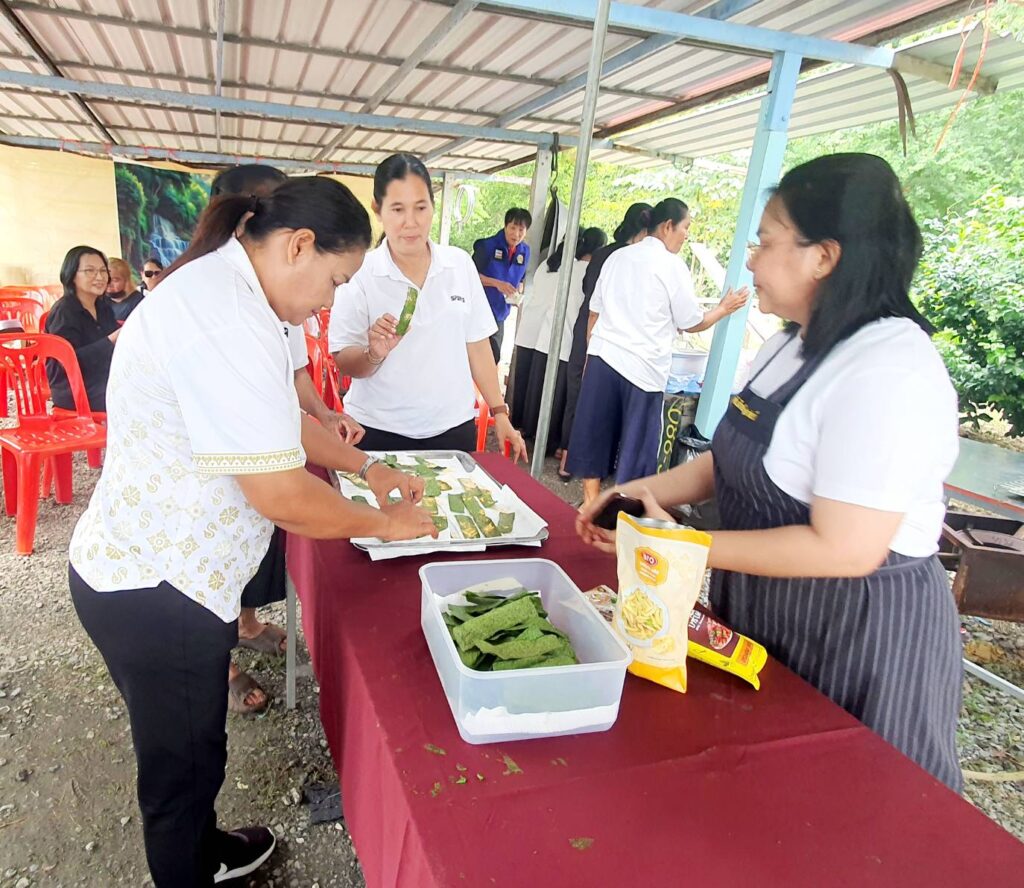 โอกาสนี้ คณาจารย์ได้สาธิตวิธีและให้สมาชิกวิสาหกิจชุมชนฯ ได้ร่วมกันทดลองทำผักหวานป่าแผ่นทอดกรอบปรุงรส และทองม้วนผักหวานป่า เพื่อสร้างมูลค่าเพิ่มภายใต้แบรนด์สินค้า “หวานกรอบ” รวมทั้งถ่ายทอดองค์ความรู้เรื่องการคิดต้นทุนราคาสินค้า การเขียน Story Telling ที่มาของสินค้า รวมทั้งการจำหน่ายสินค้าผ่านช่องทางออนไลน์ต่าง ๆ นอกจากนี้ ยังได้ให้การสนับสนุนอุปกรณ์ ได้แก่ เตาอบ เครื่องทำทองม้วน และบรรจุภัณฑ์พร้อมฉลากสินค้าให้กับทางกลุ่ม รวมทั้งเตรียมพัฒนาผลิตภัณฑ์ใหม่ ๆ ให้ตรงตามความต้องการของวิสาหกิจชุมชน เพื่อยกระดับและสร้างรายได้ให้กับชุมชนต่อไป