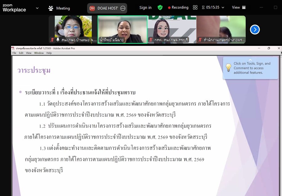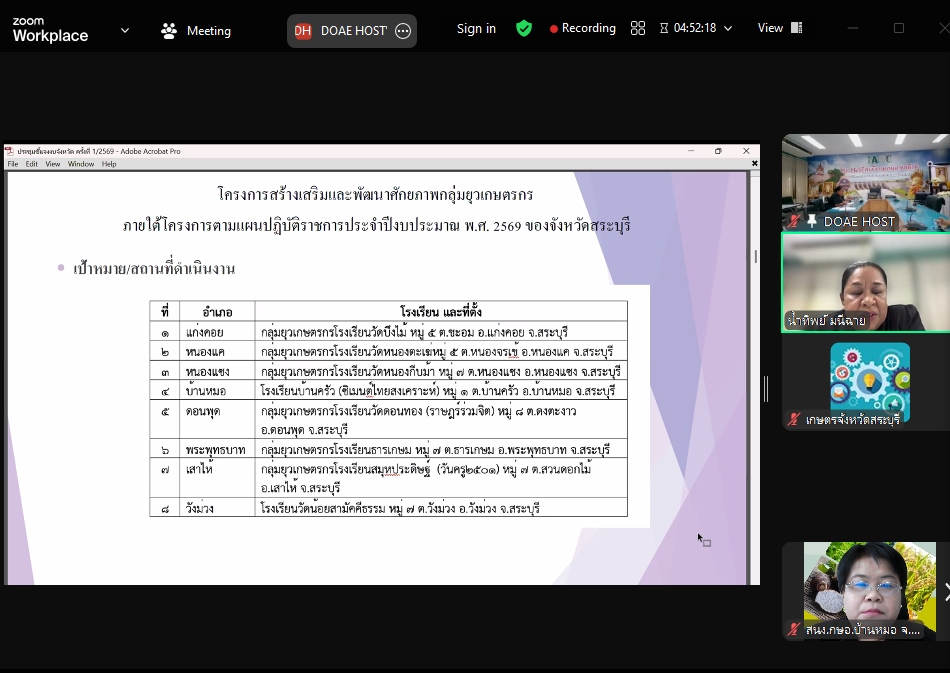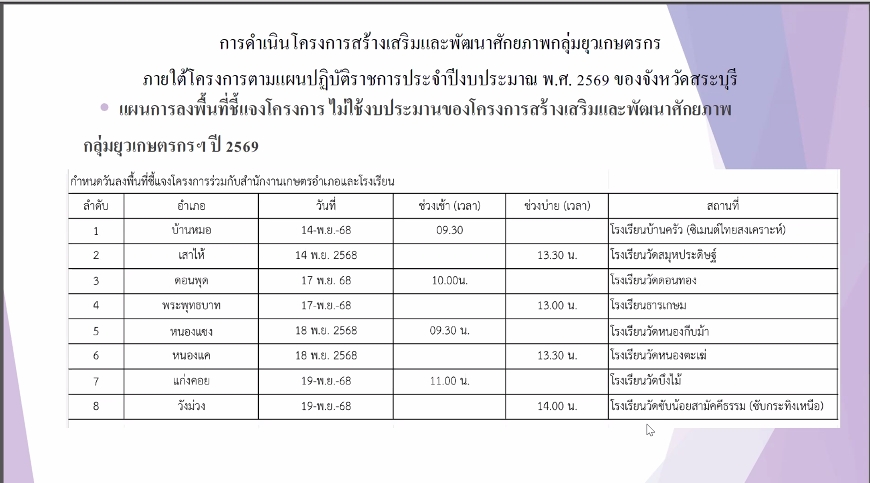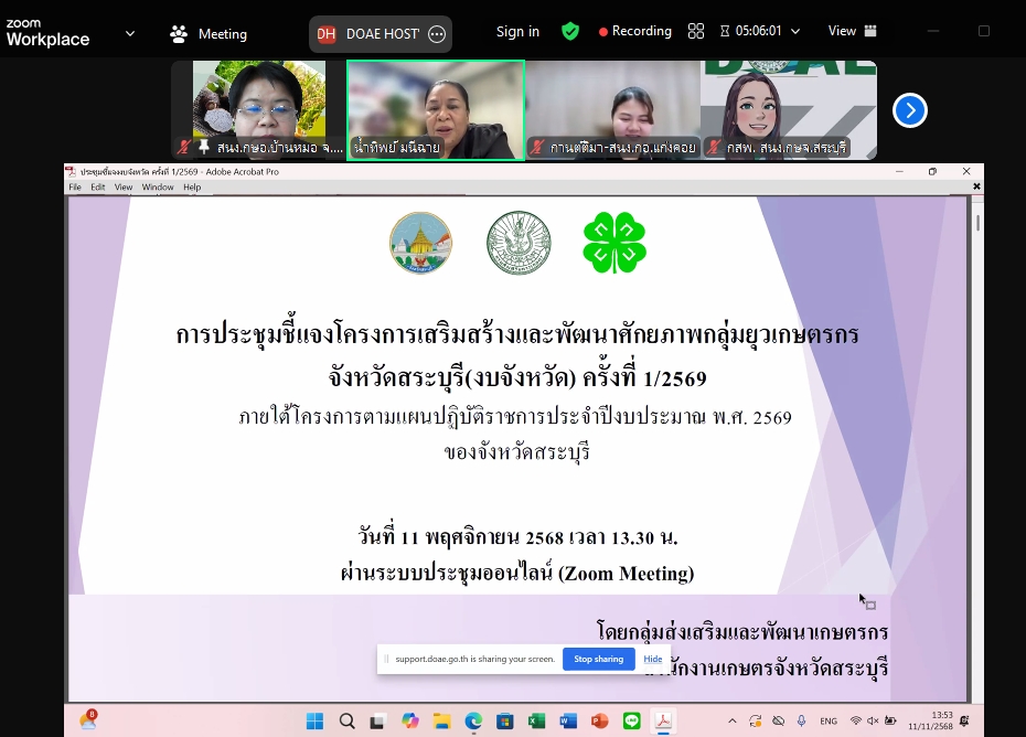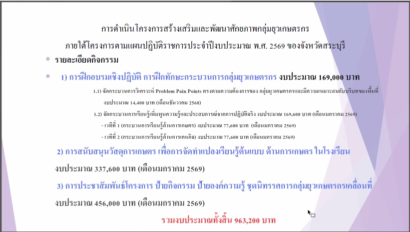 วันที่ 11 พฤศจิกายน 2568 นางสาวอัจฉรา สุขสมบูรณ์ เกษตรอำเภอบ้านหมอ พร้อมด้วย นางอุไรวรรณ โตสารเดช นักวิชาการส่งเสริมการเกษตรชำนาญการ สำนักงานเกษตรอำเภอบ้านหมอ เข้าร่วมการประชุมชี้แจงโครงการเสริมสร้างและพัฒนาศักยภาพกลุ่มยุวเกษตรกร จังหวัดสระบุรี (งบจังหวัด) ครั้งที่ 1/2569 ภายใต้โครงการตามแผนปฏิบัติราชการประจำปีงบประมาณ พ.ศ. 2569 ของจังหวัดสระบุรี ผ่านการประชุมออนไลน์ระบบ Zoom Meeting โดยมีนายปรีชา สายแสง เกษตรจังหวัดสระบุรี เป็นประธานการประชุม ร่วมด้วย นางสาวน้ำทิพย์ มณีฉาย หัวหน้ากลุ่มส่งเสริมและพัฒนาเกษตรกร สำนักงานเกษตรจังหวัดสระบุรี ร่วมชี้แจง เพื่อให้ทราบขั้นตอนและกิจกรรมต่าง ๆ ให้สามารถปฏิบัติงานได้เรียบร้อยและเสร็จสิ้นภายในระยะเวลาที่กำหนด