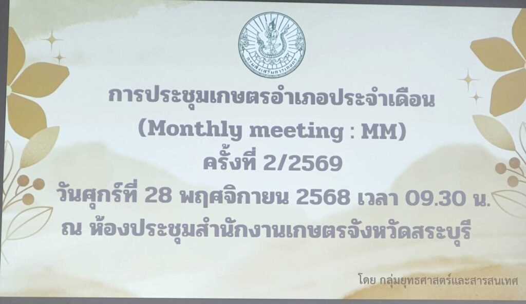 วันศุกร์ที่ 28 พฤศจิกายน 2568 นางสาวอัจฉรา สุขสมบูรณ์ เกษตรอำเภอบ้านหมอ เข้าร่วมการประชุมเกษตรอำเภอประจำเดือนพฤศจิกายน 2568 ครั้งที่ 2/2569 (Monthly Meeting : MM) เพื่อหารือข้อราชการและรับทราบแนวทางการดำเนินงานส่งเสริมการเกษตร ประจำปีงบประมาณ พ.ศ. 2569 ประกอบด้วย เรื่องแจ้งที่ประชุมจากกลุ่ม/ฝ่ายต่าง ๆ งบประมาณโครงการส่งเสริมการเกษตร ประจำปีงบประมาณ พ.ศ. 2569 (โครงการตามตัวชี้วัด) ครั้งที่ 1 และโครงการส่งเสริมการเกษตรอื่น ๆ เพื่อขับเคลื่อนการดำเนินงานตามระบบส่งเสริมการเกษตรประจำปีงบประมาณ 2569 ให้เป็นไปด้วยความเรียบร้อยและเกิดประสิทธิภาพ โดยมีนายปรีชา สายแสง เกษตรจังหวัดสระบุรี เป็นประธานในการประชุม ณ ห้องประชุมสำนักงานเกษตรจังหวัดสระบุรี ตำบลปากเพรียว อำเภอเมืองสระบุรี จังหวัดสระบุรี