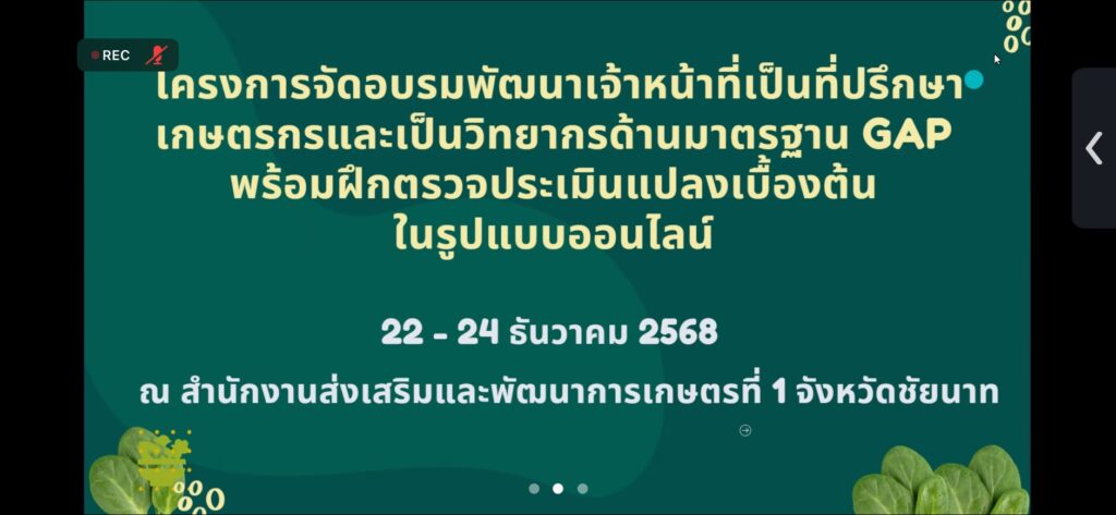 วันจันทร์ที่ 22 ธันวาคม 2568 นางสาวอัจฉรา สุขสมบูรณ์ เกษตรอำเภอบ้านหมอ จังหวัดสระบุรี มอบหมายให้ นางสาวกมลรัตน์ สุขสถาน นักวิชาการส่งเสริมการเกษตรชำนาญการพิเศษ เข้าร่วมอบรมพัฒนาเจ้าหน้าที่เป็นที่ปรึกษาเกษตรกรและเป็นวิทยากรด้านมาตรฐาน GAP พร้อมฝึกการตรวจประเมินแปลงเบื้องต้น ผ่านระบบออนไลน์ (Zoom Meeting) จาก สำนักงานส่งเสริมและพัฒนาการเกษตรที่ 1 จังหวัดชัยนาทระหว่างวันที่ 22-24 ธันวาคม 2568 เพื่อให้เจ้าหน้าที่ผู้ปฏิบัติงานในระดับพื้นที่มีความรู้ และเข้าใจในการปฏิบัติหน้าที่ เป็นที่ปรึกษาเกษตรกร และสามารถถ่ายทอดความรู้ตามระบบคุณภาพและมาตรฐาน GAP ณ ห้องประชุมสำนักงาน เกษตรจังหวัดสระบุรี ตำบลปากเพรียว อำเภอเมืองสระบุรี จังหวัดสระบุรี