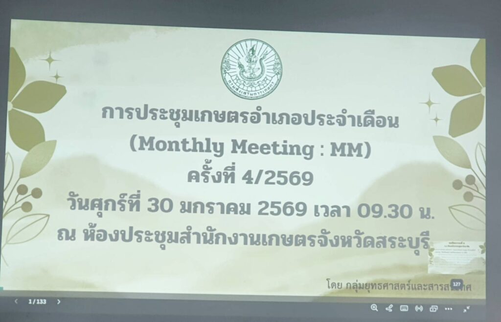 วันศุกร์ที่ 30 มกราคม 2569 นางสาวอัจฉรา สุขสมบูรณ์ เกษตรอำเภอบ้านหมอ เข้าร่วมการประชุมเกษตรอำเภอประจำเดือนมกราคม 2569 ครั้งที่ 4/2569 (Monthly Meeting : MM) เพื่อหารือข้อราชการและรับทราบแนวทางการดำเนินงานส่งเสริมการเกษตร ประจำปีงบประมาณ พ.ศ. 2569 โดยก่อนเริ่มวาระประชุมได้มีการมอบประกาศนียบัตรแก่เกษตรอำเภอ และเจ้าหน้าที่อำเภอในการร่วมขับเคลื่อนการประกวดเกษตรกร บุคคลทางการเกษตร และสถาบันเกษตรกรดีเด่น ระดับจังหวัด ปี 2569 ทั้งนี้ รางวัลชนะเลิศอันดับที่ 1 ทุกสาขา/ประเภท จะมอบในงานคลินิกเกษตรเคลื่อนที่ในพระราชานุเคราะห์ฯ ครั้งที่ 2/2569 ณ โดมวัดหัวถนน อำเภอเมืองสระบุรี จังหวัดสระบุรี วัตถุประสงค์การประชุมครั้งนี้ ประกอบด้วย เรื่องแจ้งที่ประชุมจากกลุ่ม/ฝ่ายต่าง ๆ, การวางแผนการขับเคลื่อนงานตามระบบส่งเสริมการเกษตร ประจำปีงบประมาณ 2569, การดำเนินงานตามแผนงาน/โครงการส่งเสริมการเกษตร และแผนการปฏิบัติงานตามระบบส่งเสริมการเกษตร ประจำเดือนกุมภาพันธ์ 2569 เพื่อให้เป็นไปด้วยความเรียบร้อยและเกิดประสิทธิภาพ โดยมีนายปรีชา สายแสง เกษตรจังหวัดสระบุรี เป็นประธานในการประชุม ณ ห้องประชุมสำนักงานเกษตรจังหวัดสระบุรี ตำบลปากเพรียว อำเภอเมืองสระบุรี จังหวัดสระบุรี