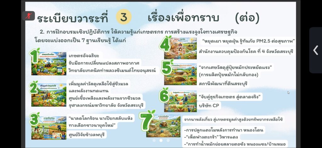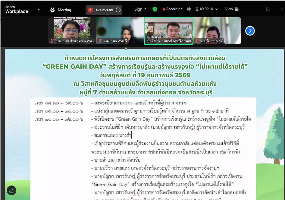 วันที่ 9 กุมภาพันธ์ 2569 นางสาวอัจฉรา สุขสมบูรณ์ เกษตรอำเภอบ้านหมอ พร้อมด้วย เจ้าหน้าที่สำนักงานเกษตรอำเภอบ้านหมอ เข้าร่วมประชุมคณะทำงานจัดงานโครงการเป็นมิตรกับสิ่งแวดล้อม “Green gain day สร้างการเรียนรู้และสร้างแรงจูงใจ ไม่เผาแต่ได้รายได้” ผ่านระบบ zoom meeting เพื่อเป็นการเตรียมความพร้อม ในการจัดงานในวันที่ 19 กุมภาพันธ์ 2569 สถานที่จัดงาน วิสาหกิจชุมชนศูนย์เมล็ดพันธุ์ข้าวชุมชนตำบลห้วยแห้ง อำเภอแก่งคอย จังหวัดสระบุรี ณ สำนักงานเกษตรอำเภอบ้านหมอ จังหวัดสระบุรี