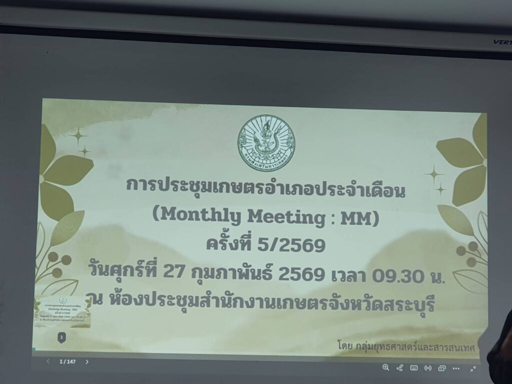 วันศุกร์ที่ 27 กุมภาพันธ์ 2569 นางสาวอัจฉรา สุขสมบูรณ์ เกษตรอำเภอบ้านหมอ เข้าร่วมการประชุมเกษตรอำเภอประจำเดือนกุมภาพันธ์ 2569 ครั้งที่ 5/2569 (Monthly Meeting : MM) เพื่อหารือข้อราชการและรับทราบแนวทางการดำเนินงานส่งเสริมการเกษตร ประจำปีงบประมาณ พ.ศ. 2569 เรื่องแจ้งที่ประชุมจากกลุ่ม/ฝ่ายต่าง ๆ, การวางแผนการขับเคลื่อนงานตามระบบส่งเสริมการเกษตร ประจำปีงบประมาณ 2569, การคัดเลือกเกษตรกร บุคคลทางการเกษตร และสถาบันเกษตรกรดีเด่นระดับเขต ประจำปี 2569, กำหนดจัดงานวันถ่ายทอดเทคโนโลยีเพื่อเริ่มต้นฤดูกาลผลิตใหม่ (Field Day) ณ อำเภอมวกเหล็ก จังหวัดสระบุรี, คำสั่งแต่งตั้งคณะทำงานและการติดตามนิเทศงานตามระบบส่งเสริมการเกษตร ประจำปี 2569 และแผนการปฏิบัติงานตามระบบส่งเสริมการเกษตร ประจำเดือนมีนาคม 2569 เพื่อให้การดำเนินงานเป็นไปด้วยความเรียบร้อยและเกิดประสิทธิภาพ โดยมีนายปรีชา สายแสง เกษตรจังหวัดสระบุรี เป็นประธานในการประชุม ณ ห้องประชุมสำนักงานเกษตรจังหวัดสระบุรี ตำบลปากเพรียว อำเภอเมืองสระบุรี จังหวัดสระบุรี