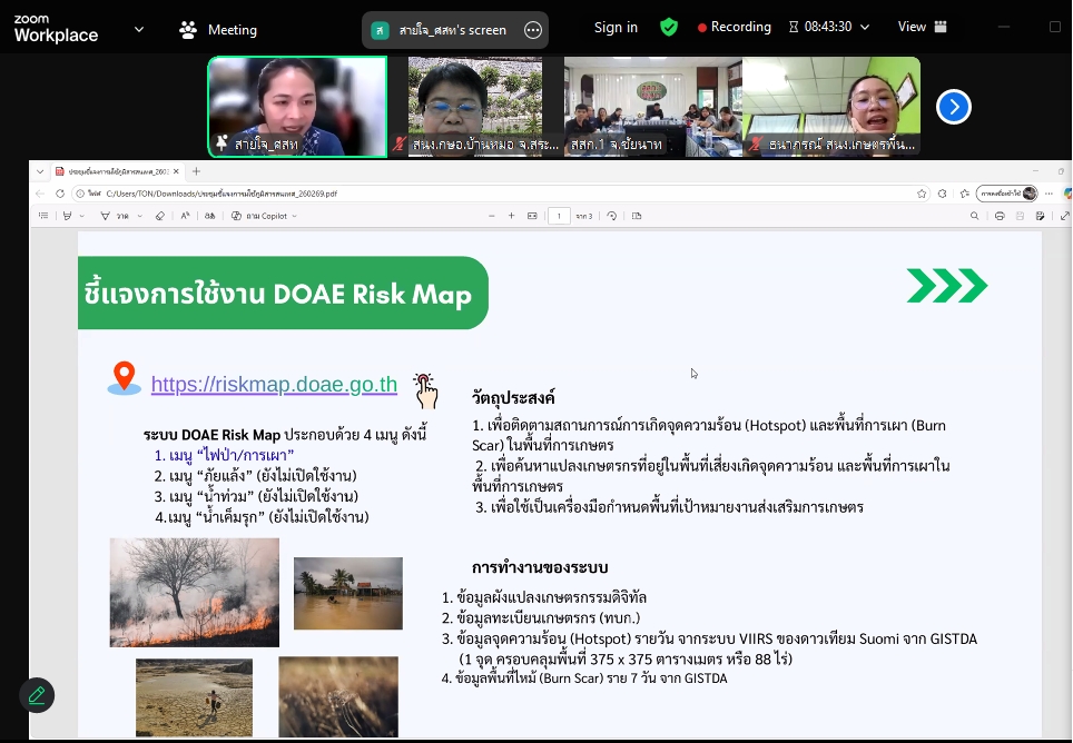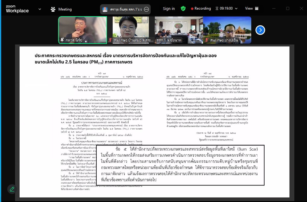 วันศุกร์ที่ 10 เมษายน 2569 นางสาวอัจฉรา สุขสมบูรณ์ เกษตรอำเภอบ้านหมอ พร้อมด้วย นางสาวกมลรัตน์ สุขสถาน นักวิชาการส่งเสริมการเกษตรชำนาญการพิเศษ และนางสาวสุภาวดี พุกเจริญ นักวิชาการส่งเสริมการเกษตร สำนักงานเกษตรอำเภอบ้านหมอ เข้าร่วมประชุมชี้แจงแนวทางการดำเนินการตามประกาศกระทรวงเกษตรและสหกรณ์ เรื่อง มาตรการบริหารจัดการป้องกัน และแก้ไขปัญหา ฝุ่นละอองขนาดเล็กไม่เกิน ๒.๕ ไมครอน (PM ๒.๕) ภาคการเกษตร (ฉบับที่ 2) ผ่านระบบ Zoom Meeting จากสำนักงานส่งเสริมและพัฒนาการเกษตรที่ 1 จังหวัดชัยนาท เพื่อให้การดำเนินงานเป็นไปในแนวทางเดียวกัน ณ สำนักงานเกษตรอำเภอบ้านหมอ ต.บางโขมด อ.บ้านหมอ จ.สระบุรี