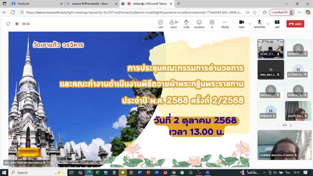 วันที่ 2 ตุลาคม 2568 นางสาวอัจฉรา สุขสมบูรณ์ เกษตรอำเภอบ้านหมอ พร้อมด้วย เจ้าหน้าที่สำนักงานเกษตรอำเภอบ้านหมอ เข้าร่วมประชุมการดำเนินงานพิธีถวายผ้าพระกฐินพระราชทาน ประจำปี พ.ศ. 2568 ผ่านระบบออนไลน์ Microsoft teams meeting ณ สำนักงานเกษตรอำเภอบ้านหมอ ตำบลบางโขมด อำเภอบ้านหมอ จังหวัดสระบุรี โดยมี นายรพีทัศน์ อุ่นจิตตพันธ์ รองอธิบดีกรมส่งเสริมการเกษตร เป็นประธานการประชุม เพื่อเตรียมความพร้อมในการดำเนินงานพิธีถวายผ้าพระกฐินพระราชทานของกรมส่งเสริมการเกษตร ประจำปี พ.ศ. 2568 ในวันที่ 2 พฤศจิกายน 2568 ณ วัดเขาแก้ววรวิหาร ตำบลต้นตาล อำเภอเสาไห้ จังหวัดสระบุรี
