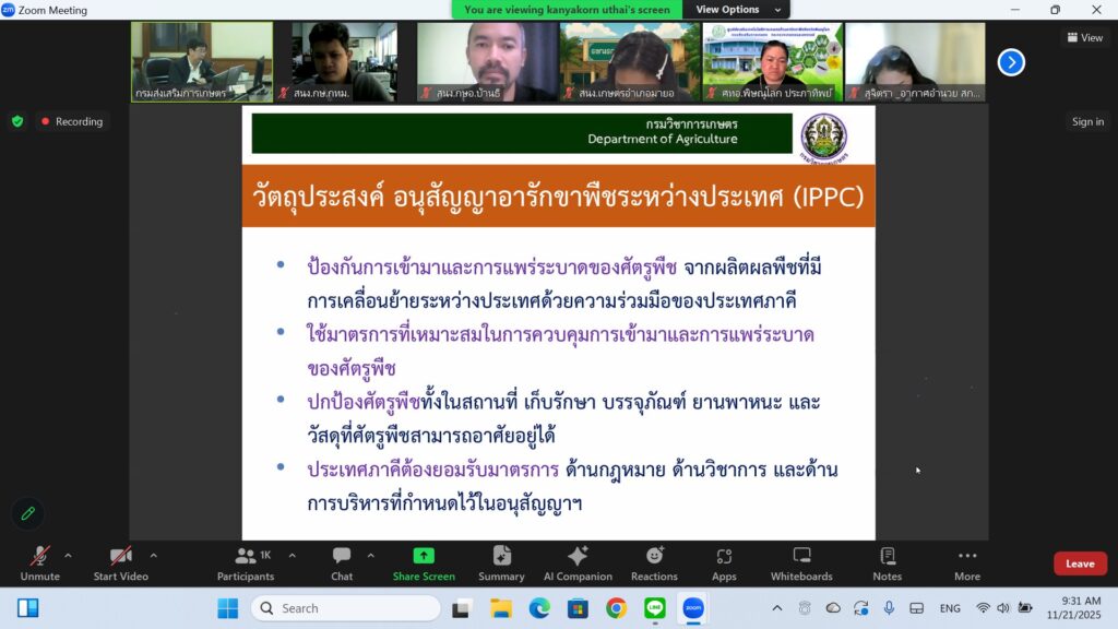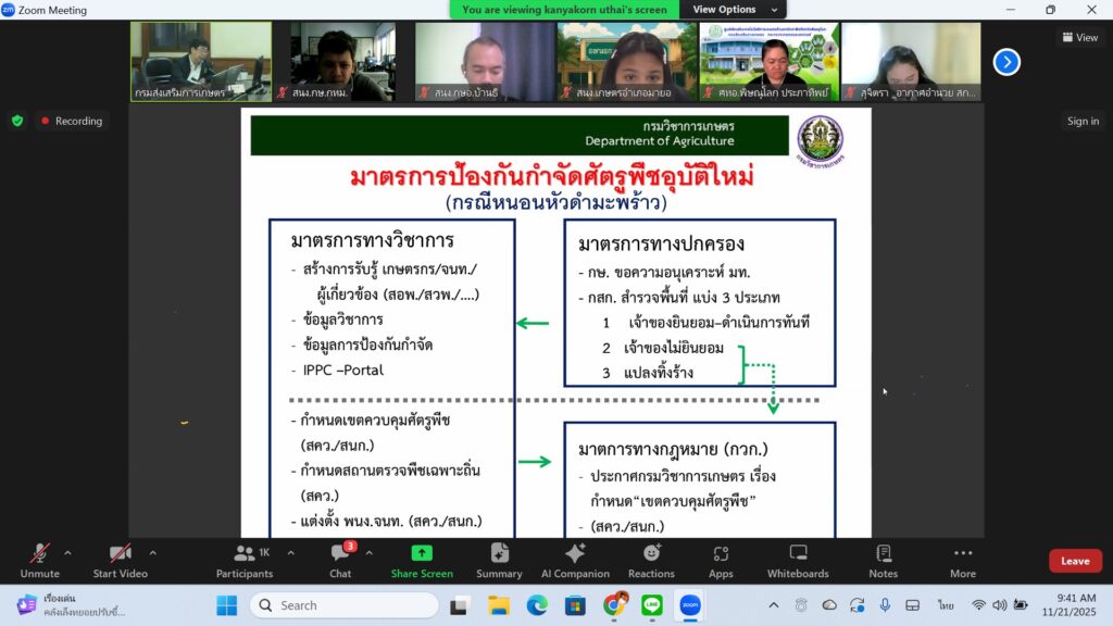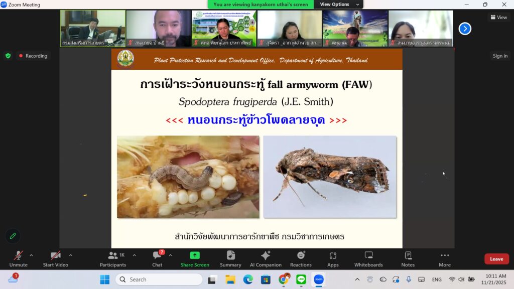 วันที่ 21 พฤศจิกายน 2568 นายชาญชัย โฉมงาม เกษตรอำเภอดอนพุด มอบหมายให้ นางสาวปาริชาต ศรีใส นักวิชาการส่งเสริมการเกษตรชำนาญการ เข้าร่วมอบรมพัฒนาเจ้าหน้าที่ในการเฝ้าระวังและเตรียมความพร้อมรับมือสถานการณ์การระบาดศัตรูพืชเชิงรุก ผ่านระบบออนไลน์ Zoom Meeting จากกรมส่งเสริมการเกษตร โดยมีวัตถุประสงค์เพื่อให้เจ้าหน้าที่ส่วนกลาง เจ้าหน้าที่อารักขาพืช ระดับจังหวัด ระดับอำเภอ และเจ้าหน้าที่ศูนย์ส่งเสริมเทคโนโลยีการเกษตรด้านอารักขาพืช ให้มีความรู้และทักษะในการเฝ้าระวังศัตรูพืช การสำรวจศัตรูพืช การวินิจฉัยพืช การประมาณพื้นที่ระบาด การรายงานข้อมูล การคาดการณ์การระบาดและการแจ้งเตือนการระบาดศัตรูพืช ณ สำนักงานเกษตรอำเภอดอนพุด ตำบลดอนพุด อำเภอดอนพุด จังหวัดสระบุรี