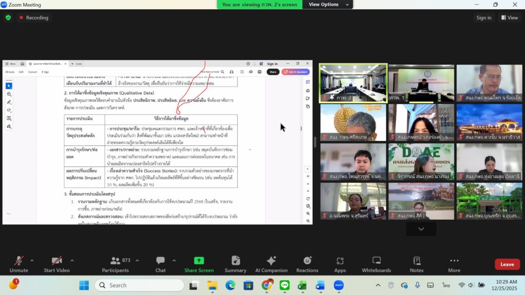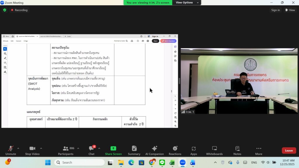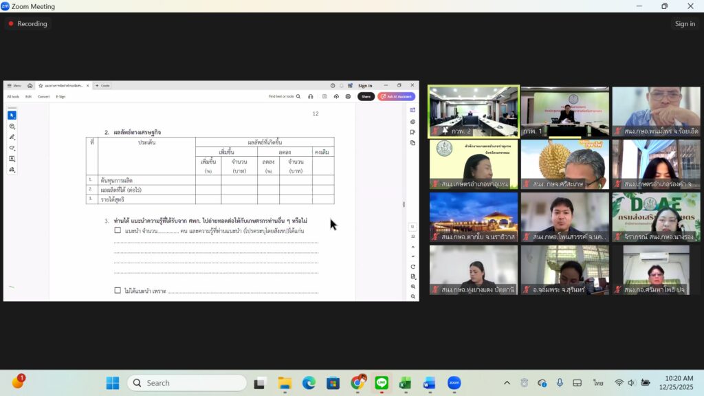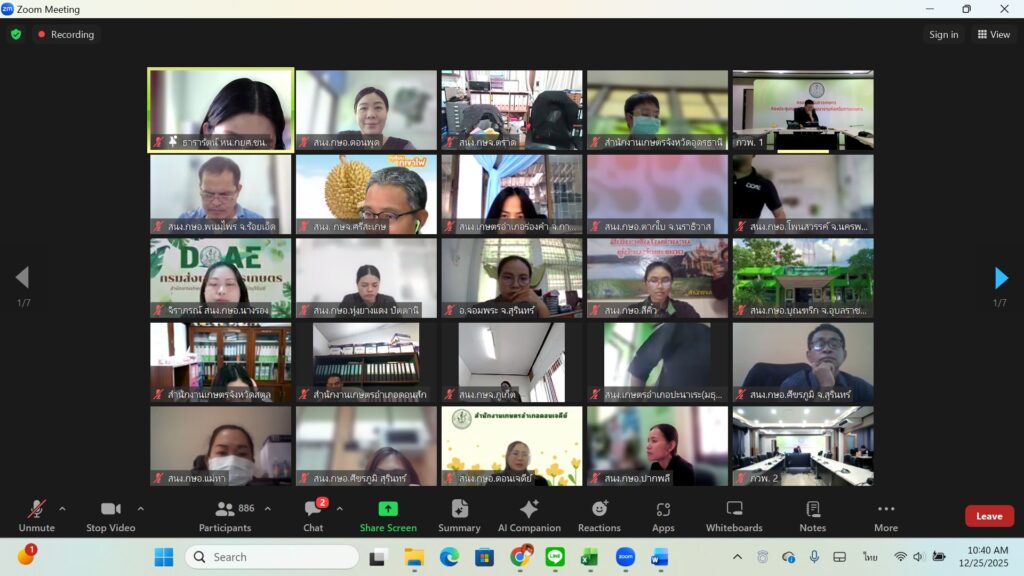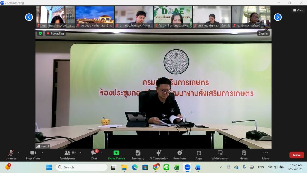 วันพฤหัสบดีที่ 25 ธันวาคม พ.ศ. 2568 นายชาญชัย โฉมงาม เกษตรอำเภอดอนพุด มอบหมายให้ นางสาวปาริชาต ศรีใส นักวิชาการส่งเสริมการเกษตรชำนาญการ เข้าร่วมประชุมชี้แจงประเด็นตัวชี้วัดกิจกรรมพัฒนาศักยภาพและประเด็นตัวชี้วัดแผนพัฒนาการเกษตร โดย กองงานวิจัยและพัฒนางานส่งเสริมเกษตรผ่าน Application Zoom การประชุมในครั้งนี้มีวัตถุประสงค์เพื่อชี้แจงแนวทางการจัดทำคำขอจัดสรรงบประมาณ กิจกรรมพัฒนาศักยภาพ ศูนย์เรียนรู้การเพิ่มประสิทธิภาพการผลิตสินค้าเกษตร (ศพก.)ประจำปีงบประมาณ 2569 การรายงานผลความคุ้มค่าของการใช้จ่ายงบประมาณกิจกรรมพัฒนาศักยภาพ ศพก. ปี 2568 การจัดทำแผนพัฒนา ศพก. ปี 2569-2570 และกรอบการพัฒนาการเกษตรเชิงพื้นที่ ระดับอำเภอ รวมทั้งการจัดทำ One Page Project Design ณ สำนักงานเกษตรอำเภอดอนพุด ตำบลดอนพุด อำเภอดอนพุด จังหวัดสระบุรี