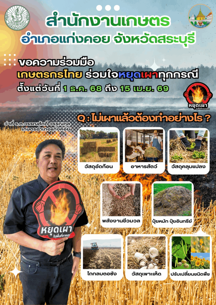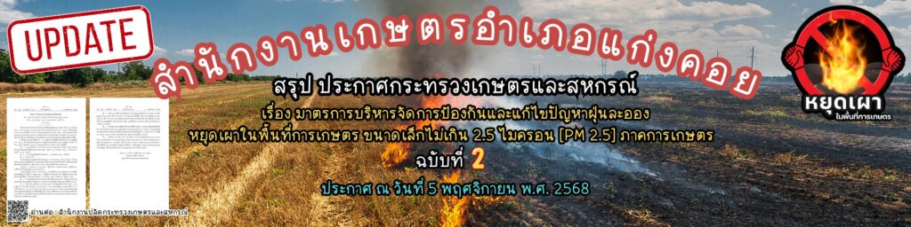 ประกาศกระทรวงเกษตรและสหกรณ์เรื่อง มาตรการบริหารจัดการป้องกันและแก้ไขปัญหาฝุ่นละอองขนาดเล็ก ไม่เกิน 2.5 ไมครอน (PM 2.5)ภาคการเกษตร (ฉบับที่ 2) พ.ศ. 2568สำนักงานเกษตรอำเภอแก่งคอย