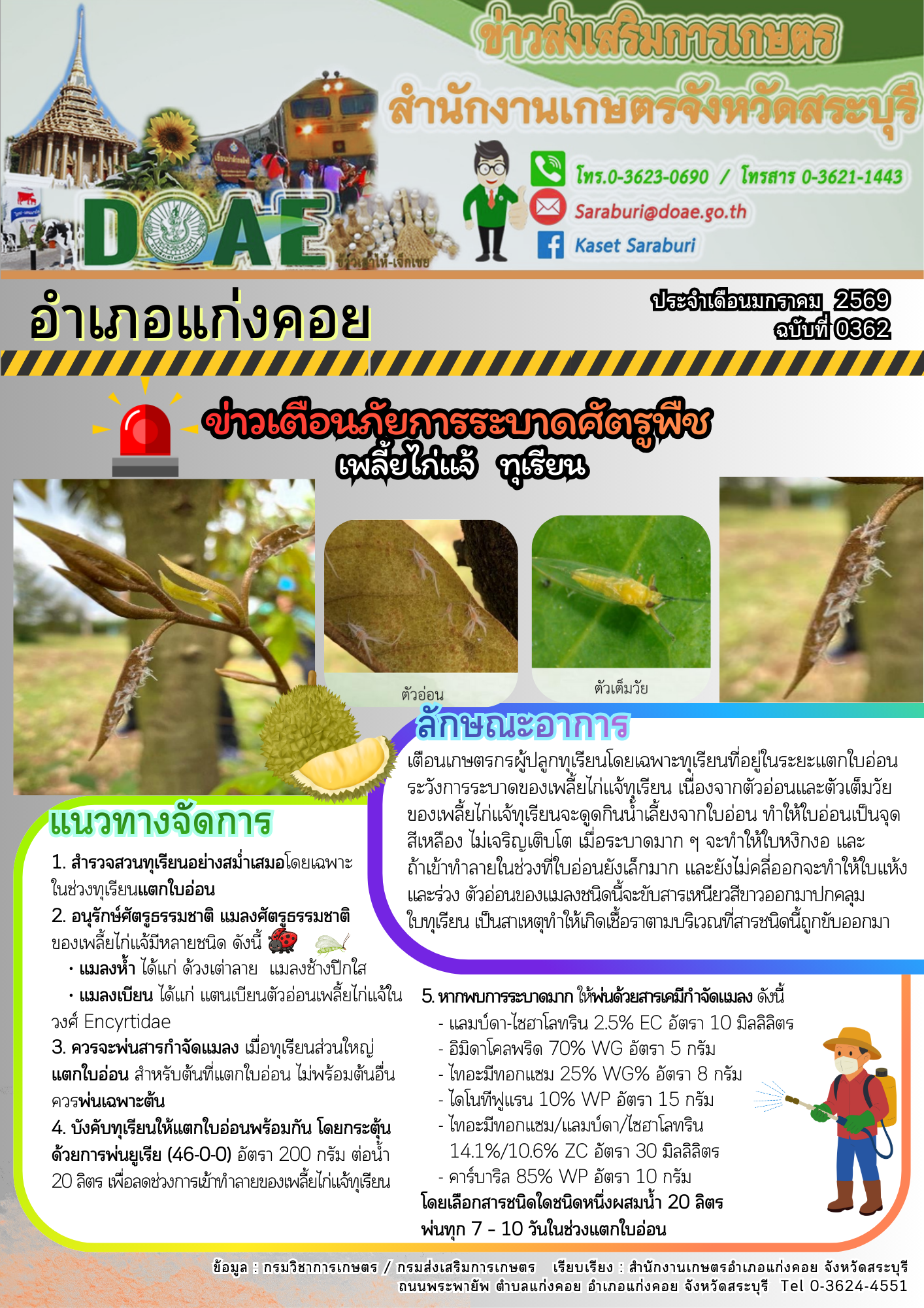 ขอความร่วมมืองดเผา (2)5ลดราคาปุ๋ยเคมีเพื่อเกษตรกร 68Banner-ส่งพัสดฺุBarner-ตลาดเกษตรกรbanner-website-เชิญชวนขึ้นทะเบียนเกษตรกร-01 ข่าวส่งเสริมการเกษตรข่าวเตือนการระบาดข่าวประกาศ/คำสั่ง จัดกระบวนการเรียนรู้เพิ่มพูนความรู้และประสบการณ์ เวทีที่ 1 ด้านการเกษตร ภายใต้โครงการตามแผนปฏิบัติราชการ ประจำปีงบประมาณ พ.ศ. 2569อ่านต่อ…จัดกระบวนการเรียนรู้เพื่อเพิ่มศักยภาพกลุ่มเกษตรกรผู้ผลิตสมุนไพร โครงการส่งเสริมและพัฒนาสินค้าเกษตรชีวภาพเพื่อเข้าสู่ห่วงโซ่อุปทานเศรษฐกิจชีวภาพอ่านต่อ…ประชุมเจ้าหน้าที่สำนักงานเกษตรอำเภอประจำสัปดาห์ (Weekly Meeting) ตามระบบส่งเสริมการเกษตร (T&V System)อ่านต่อ…จัดเวทีประชาคมการจัดทำแผนพัฒนาการเกษตรระดับหมู่บ้าน โครงการจัดเก็บข้อมูลด้านการเกษตรในระดับพื้นที่อ่านต่อ…สำนักงานเกษตรจังหวัดสระบุรี ดำเนินการประเมินศักยภาพแปลงใหญ่ในอำเภอแก่งคอย เพื่อยกระดับการบริหารจัดการแปลงใหญ่ให้มีประสิทธิภาพอ่านต่อ…โครงการส่งเสริมและพัฒนาสินค้าเกษตรชีวภาพเพื่อเข้าสู่ห่วงโซ่อุปทานเศรษฐกิจชีวภาพอ่านต่อ…ประชุมเจ้าหน้าที่สำนักงานเกษตรอำเภอประจำสัปดาห์ (Weekly Meeting) และประชุมสำนักงานประจำเดือน ตามระบบส่งเสริมการเกษตร (T&V Systemอ่านต่อ…ประชุมเจ้าหน้าที่สำนักงานเกษตรอำเภอประจำสัปดาห์ (Weekly Meeting) เพื่อทบทวนการทำงาน ปัญหา อุปสรรค สิ่งที่จะต้องแก้ไข ในช่วงสัปดาห์ที่ผ่านมา และชี้แจงข้อราชการต่างๆอ่านต่อ…ลงพื้นที่ตรวจสอบข้อมูลจุดความร้อนตามรายงานสถานการณ์การ เผาในพื้นที่การเกษตร จังหวัดสระบุรี ข้อมูลจาก gistdaอ่านต่อ…ประชุมเกษตรอำเภอประจำเดือนธันวาคม 2568 ครั้งที่ 3/2569 (Monthly Meeting : MM)อ่านต่อ…ประชุมเจ้าหน้าที่สำนักงานเกษตรอำเภอประจำสัปดาห์ (Weekly Meeting) และประชุมสำนักงานประจำเดือน ตามระบบส่งเสริมการเกษตร (T&V System)อ่านต่อ…ติดตามการดำเนินงานของวิสาหกิจชุมชนนานาผลิตภัณฑ์สตรีตำบลท่าคล้อ และลงพื้นที่สำรวจสถานการณ์การระบาดของโรคและแมลงศัตรูพืชอ่านต่อ… ใบด่างมันสำปะหลังหนอนหัวดำ มะพร้าวเพลี้ยไก่แจ้ ทุเรียนหนอนหน้าแมว ปาล์มน้ำมันหนอนหัวดำมะพร้าวหนอนกระทู้ในมันสำปะหลังโรครากเน่าโคนเน่าในทุเรียน“โรคใบใหม้” ในปาล์มน้ำมันเตือนระวัง “โรคเมดิออยด์” (โรคไ้ข้ดิน) Melioidosisแมลงดำหนามข้าว : rlice hispaโรคใบส้ม หรือ โรคใบขีดโปร่งแสง ศัตรูข้าวการกำจัด : ควบคุม หนอนกระทู้ข้าวโพดลายจุด ประกาศกระทรวงเกษตรและสหกรณ์เรื่อง มาตรการบริหารจัดการป้องกันและแก้ไขปัญหาฝุ่นละอองขนาดเล็ก ไม่เกิน 2.5 ไมครอน (PM 2.5)ภาคการเกษตร (ฉบับที่ 2) พ.ศ. 2568สำนักงานเกษตรอำเภอแก่งคอย อ่านทั้งหมด ที่