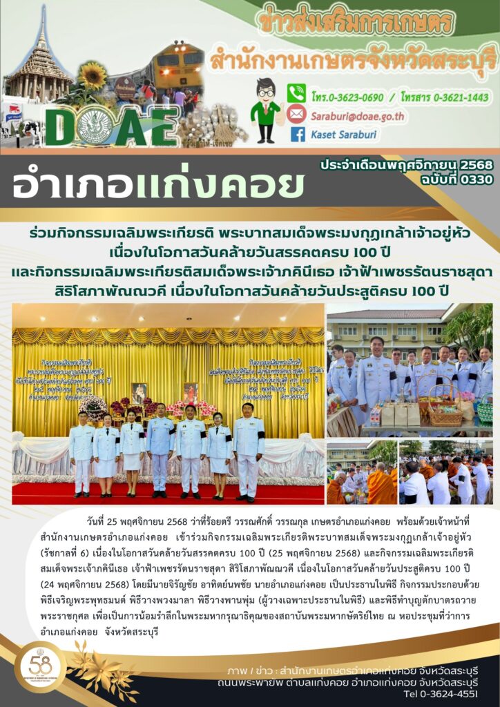 เข้าร่วมกิจกรรมเฉลิม พระเกียรติพระบาทสมเด็จพระมงกุฏเกล้าเจ้าอยู่หัว(รัชกาลที่ 6) เนื่องในโอกาสวันคล้ายวันสรรคตครบ 100 ปีBy สำนักงานเกษตรอำเภอแก่งคอย / 26/11/2025
