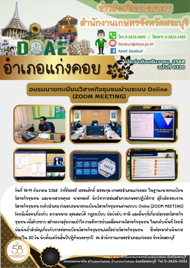 อบรมนายทะเบียนวิสาหกิจชุมชนผ่านระบบ Online (ZOOM MEETING) โดยมีเนื้อหาเกี่ยวกับ ความหมาย คุณสมบัติ กฎระเบียบ ข้อบังคับ ภาษี และอื่นๆที่เกี่ยวข้องของวิสาหกิจชุมชนBy สำนักงานเกษตรอำเภอแก่งคอย / 23/01/2026