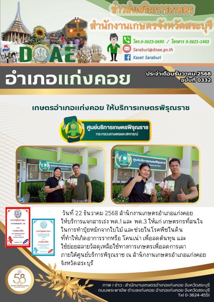 บริการเกษตรกรภายใต้ศูนย์บริการพิรุณราช แจกสารเร่ง พด.1 และ พด.3 ให้แก่เกษตรกรที่สนใจในการทำปุ๋ยหมักจากใบไม้By สำนักงานเกษตรอำเภอแก่งคอย / 23/01/2026