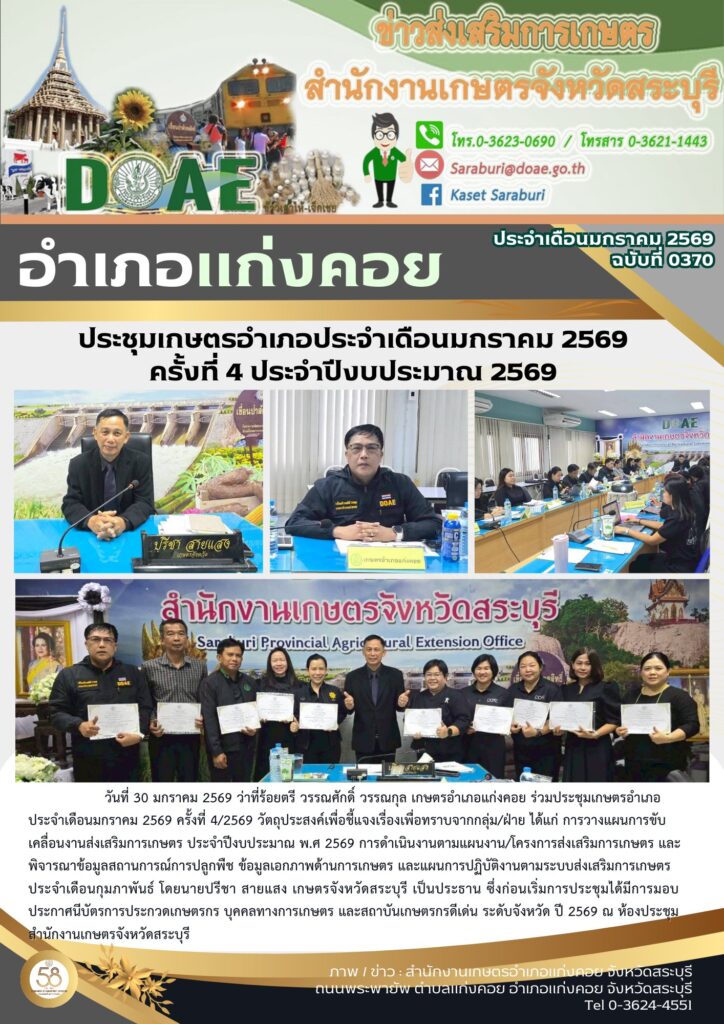 ร่วมประชุมเกษตรอำเภอประจำเดือนมกราคม 2569 ครั้งที่ 4/2569 วัตถุประสงค์เพื่อชี้แจงเรื่องเพื่อทราบจากกลุ่ม/ฝ่าย ได้แก่ การวางแผนการขับเคลื่อนงานส่งเสริมการเกษตร ประจำปีงบประมาณ พ.ศ 2569By สำนักงานเกษตรอำเภอแก่งคอย / 11/02/2026