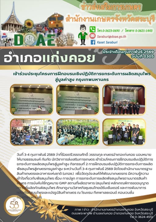 เข้าร่วมโครงการฝึกอบรมเชิงปฎิบัติการยกระดับการผลิตสมุนไพรสู่มูลค่าสูง กิจกรรมที่ 2 การฝึกอบรมเชิงปฎิบัติการยกระดับการผลิตพืชสมุนไพรสู่เกษตรกรมูลค่าสูง ระหว่างวันที่ 3-4 กุมภาพันธ์ 2569By สำนักงานเกษตรอำเภอแก่งคอย / 11/02/2026