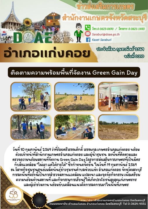 ติดตามและตรวจความพร้อมสถานที่จัดงาน Green Gain Day โครงการส่งเสริมการเกษตรที่เป็นมิตรกับสิ่งแวดล้อม “ไม่เผา แต่ได้รายได้”By สำนักงานเกษตรอำเภอแก่งคอย / 11/02/2026
