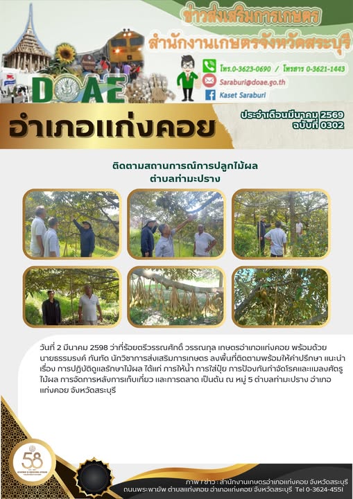 ลงพื้นที่ติดตามพร้อมให้คำปรึกษา แนะนำ เรื่อง การปฏิบัติดูแลรักษาไม้ผล ได้แก่ การให้น้ำ การใส่ปุ๋ย การป้องกันกำจัดแมลงศัตรูไม้ผล การจัดการหลังการเก็บเกี่ยวBy สำนักงานเกษตรอำเภอแก่งคอย / 11/03/2026