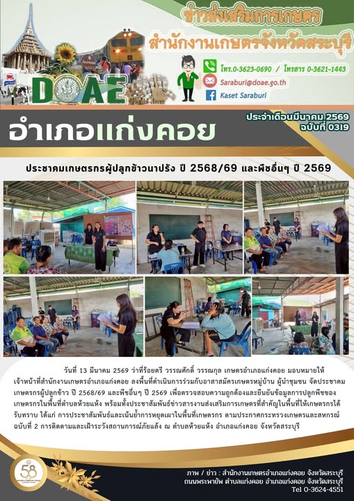 ลงพื้นที่ดำเนินการร่วมกับอาสาสมัครเกษตรหมู่บ้าน ผู้นำชุมชน จัดประชาคมเกษตรกรผู้ปลูกข้าว ปี 2568/69 และพืชอื่นๆ ปี 2569By สำนักงานเกษตรอำเภอแก่งคอย / 27/03/2026