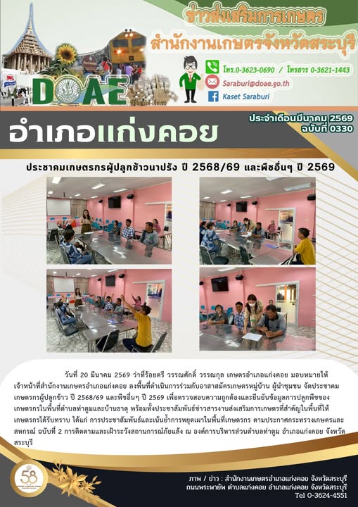 ลงพื้นที่ดำเนินการร่วมกับอาสาสมัครเกษตรหมู่บ้าน ผู้นำชุมชน จัดประชาคมเกษตรกรผู้ปลูกข้าว ปี 2568/69 และพืชอื่นๆ ปี 2569By สำนักงานเกษตรอำเภอแก่งคอย / 27/03/2026