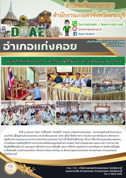 ประชุมหัวหน้าส่วนราชการ และกำนัน ผู้ใหญ่บ้าน ประจำเดือนเมษายน 2569By สำนักงานเกษตรอำเภอแก่งคอย / 09/04/2026