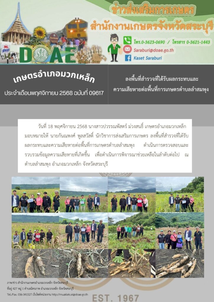 วันที่ 18 พฤศจิกายน 2568 นางสาวปวรรณพัสตร์ ม่วงสนธิ์ เกษตรอำเภอมวกเหล็ก มอบหมายให้ นายกันณพงศ์ พูลสวัสดิ์ นักวิชาการส่งเสริมการเกษตร ลงพื้นที่สำรวจที่ได้รับผลกระทบและความเสียหายต่อพื้นที่การเกษตรตำบลลำสมพุง ดำเนินการตรวจสอบและรวบรวมข้อมูลความเสียหายที่เกิดขึ้น เพื่อดำเนินการพิจารณาช่วยเหลือในลำดับต่อไป ณ ตำบลลำสมพุง อำเภอมวกเหล็ก จังหวัดสระบุรี