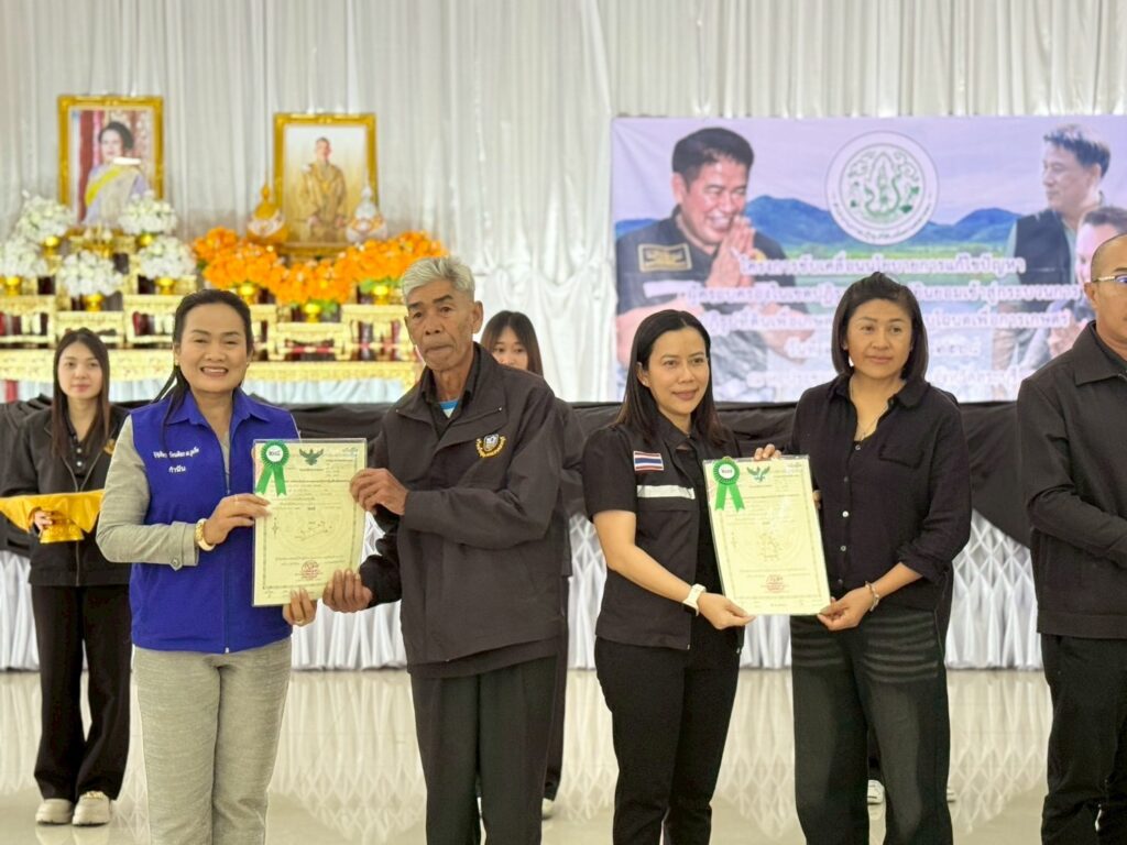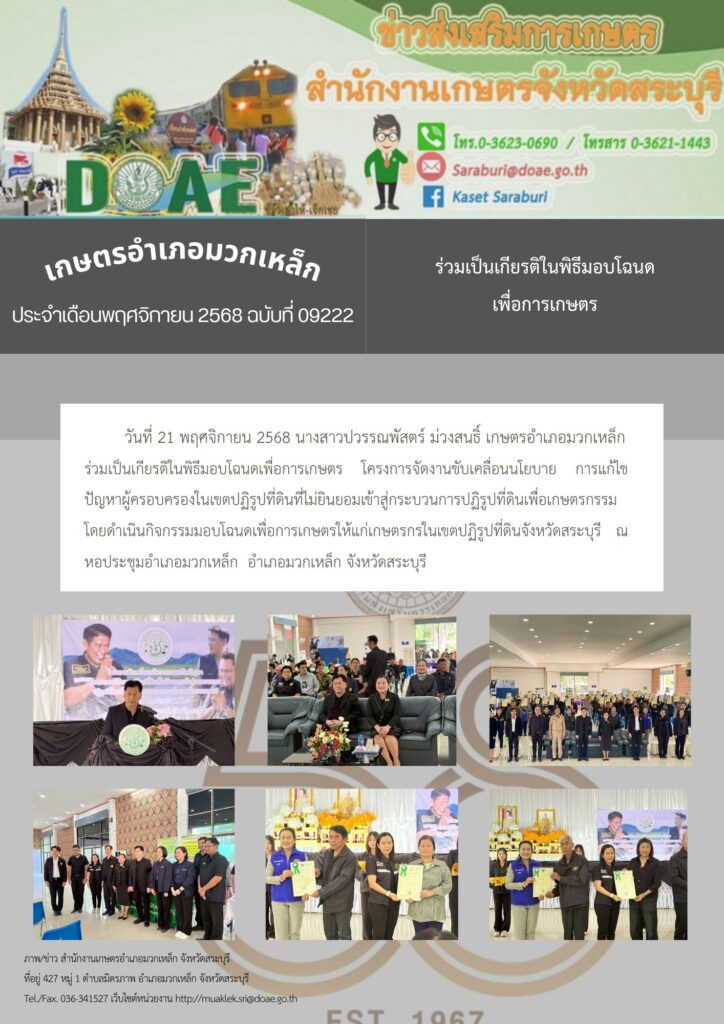 วันที่ 21 พฤศจิกายน 2568 นางสาวปวรรณพัสตร์ ม่วงสนธิ์ เกษตรอำเภอมวกเหล็ก ร่วมเป็นเกียรติในพิธีมอบโฉนดเพื่อการเกษตร โครงการจัดงานขับเคลื่อนนโยบาย การแก้ไขปัญหาผู้ครอบครองในเขตปฏิรูปที่ดินที่ไม่ยินยอมเข้าสู่กระบวนการปฏิรูปที่ดินเพื่อเกษตรกรรม โดยดำเนินกิจกรรมมอบโฉนดเพื่อการเกษตรให้แก่เกษตรกรในเขตปฏิรูปที่ดินจังหวัดสระบุรี ณ หอประชุมอำเภอมวกเหล็ก อำเภอมวกเหล็ก จังหวัดสระบุรี