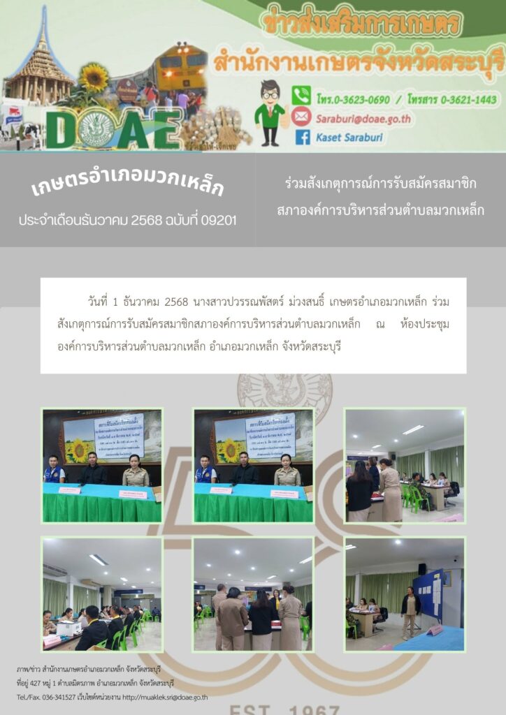วันที่ 1 ธันวาคม 2568 นางสาวปวรรณพัสตร์ ม่วงสนธิ์ เกษตรอำเภอมวกเหล็ก ร่วมสังเกตุการณ์การรับสมัครสมาชิกสภาองค์การบริหารส่วนตำบลมวกเหล็ก ณ ห้องประชุมองค์การบริหารส่วนตำบลมวกเหล็ก อำเภอมวกเหล็ก จังหวัดสระบุรี
