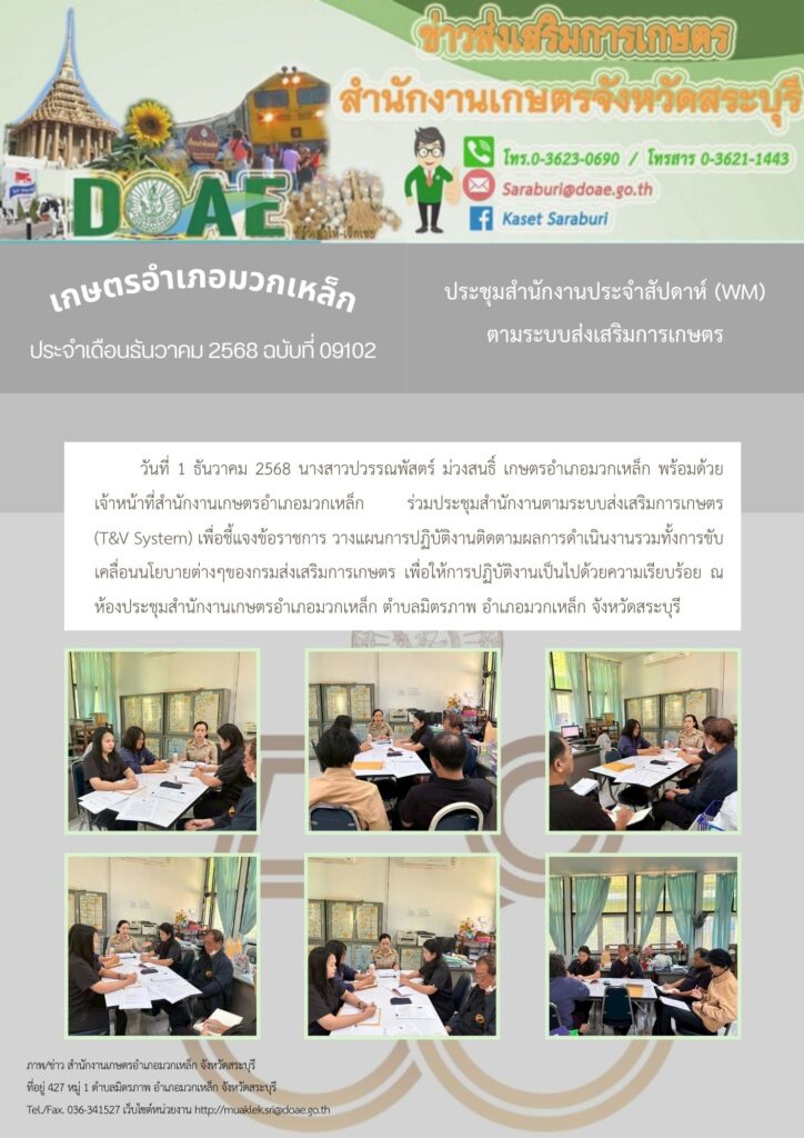 วันที่ 1 ธันวาคม 2568 นางสาวปวรรณพัสตร์ ม่วงสนธิ์ เกษตรอำเภอมวกเหล็ก พร้อมด้วย เจ้าหน้าที่สำนักงานเกษตรอำเภอมวกเหล็ก ร่วมประชุมสำนักงานตามระบบส่งเสริมการเกษตร (T&V System) เพื่อชี้แจงข้อราชการ วางแผนการปฏิบัติงานติดตามผลการดำเนินงานรวมทั้งการขับเคลื่อนนโยบายต่างๆของกรมส่งเสริมการเกษตร เพื่อให้การปฏิบัติงานเป็นไปด้วยความเรียบร้อย ณ ห้องประชุมสำนักงานเกษตรอำเภอมวกเหล็ก ตำบลมิตรภาพ อำเภอมวกเหล็ก จังหวัดสระบุรี