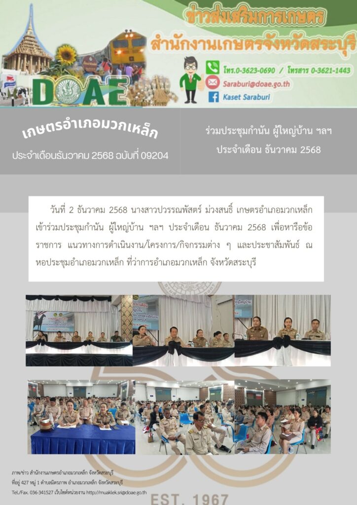 วันที่ 2 ธันวาคม 2568 นางสาวปวรรณพัสตร์ ม่วงสนธิ์ เกษตรอำเภอมวกเหล็ก เข้าร่วมประชุมกำนัน ผู้ใหญ่บ้าน ฯลฯ ประจำเดือน ธันวาคม 2568 เพื่อหารือข้อราชการ แนวทางการดำเนินงาน/โครงการ/กิจกรรมต่าง ๆ และประชาสัมพันธ์ ณ หอประชุมอำเภอมวกเหล็ก ที่ว่าการอำเภอมวกเหล็ก จังหวัดสระบุรี