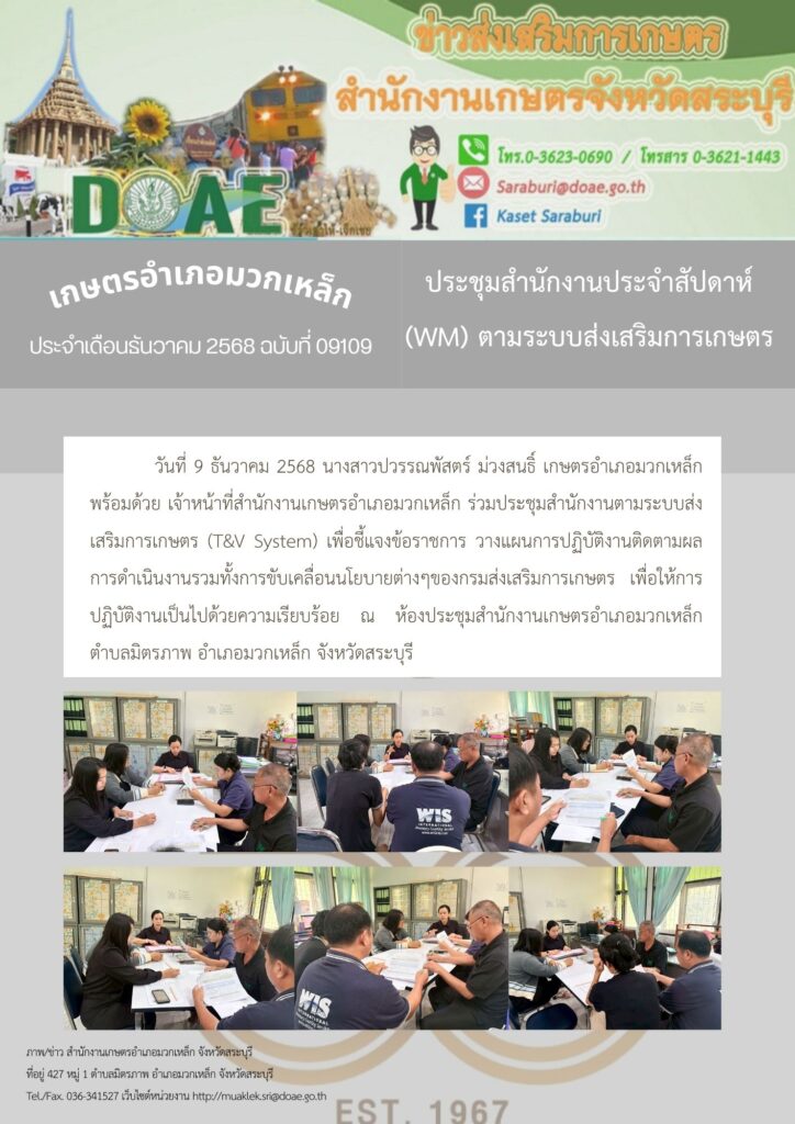 วันที่ 9 ธันวาคม 2568 นางสาวปวรรณพัสตร์ ม่วงสนธิ์ เกษตรอำเภอมวกเหล็ก พร้อมด้วย เจ้าหน้าที่สำนักงานเกษตรอำเภอมวกเหล็ก ร่วมประชุมสำนักงานตามระบบส่งเสริมการเกษตร (T&V System) เพื่อชี้แจงข้อราชการ วางแผนการปฏิบัติงานติดตามผลการดำเนินงานรวมทั้งการขับเคลื่อนนโยบายต่างๆของกรมส่งเสริมการเกษตร เพื่อให้การปฏิบัติงานเป็นไปด้วยความเรียบร้อย ณ ห้องประชุมสำนักงานเกษตรอำเภอมวกเหล็ก ตำบลมิตรภาพ อำเภอมวกเหล็ก จังหวัดสระบุรี
