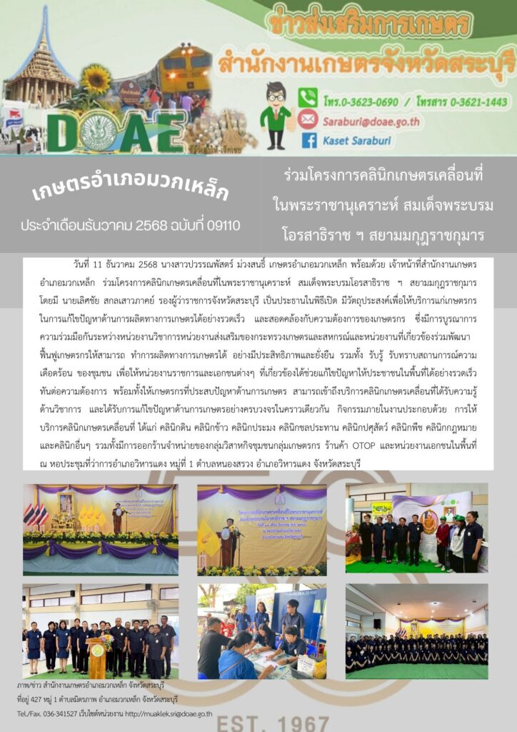 วันที่ 11 ธันวาคม 2568 นางสาวปวรรณพัสตร์ ม่วงสนธิ์ เกษตรอำเภอมวกเหล็ก พร้อมด้วย เจ้าหน้าที่สำนักงานเกษตรอำเภอมวกเหล็ก ร่วมโครงการคลินิกเกษตรเคลื่อนที่ในพระราชานุเคราะห์ สมเด็จพระบรมโอรสาธิราช ฯ สยามมกุฎราชกุมาร โดยมี นายเลิศชัย สกลเสาวภาคย์ รองผู้ว่าราชการจังหวัดสระบุรี เป็นประธานในพิธีเปิด มีวัตถุประสงค์เพื่อให้บริการแก่เกษตรกรในการแก้ไขปัญหาด้านการผลิตทางการเกษตรได้อย่างรวดเร็ว และสอดคล้องกับความต้องการของเกษตรกร ซึ่งมีการบูรณาการความร่วมมือกันระหว่างหน่วยงานวิชาการหน่วยงานส่งเสริมของกระทรวงเกษตรและสหกรณ์และหน่วยงานที่เกี่ยวข้องร่วมพัฒนาฟื้นฟูเกษตรกรให้สามารถ ทำการผลิตทางการเกษตรได้ อย่างมีประสิทธิภาพและยั่งยืน รวมทั้ง รับรู้ รับทราบสถานการณ์ความเดือดร้อน ของชุมชน เพื่อให้หน่วยงานราชการและเอกชนต่างๆ ที่เกี่ยวข้องได้ช่วยแก้ไขปัญหาให้ประชาชนในพื้นที่ได้อย่างรวดเร็วทันต่อความต้องการ พร้อมทั้งให้เกษตรกรที่ประสบปัญหาด้านการเกษตร สามารถเข้าถึงบริการคลินิกเกษตรเคลื่อนที่ได้รับความรู้ด้านวิชาการ และได้รับการแก้ไขปัญหาด้านการเกษตรอย่างครบวงจรในคราวเดียวกัน กิจกรรมภายในงานประกอบด้วย การให้บริการคลินิกเกษตรเคลื่อนที่ ได้แก่ คลินิกดิน คลินิกข้าว คลินิกประมง คลินิกชลประทาน คลินิกปศุสัตว์ คลินิกพืช คลินิกกฎหมาย และคลินิกอื่นๆ รวมทั้งมีการออกร้านจำหน่ายของกลุ่มวิสาหกิจชุมชนกลุ่มเกษตรกร ร้านค้า OTOP และหน่วยงานเอกชนในพื้นที่ ณ หอประชุมที่ว่าการอำเภอวิหารแดง หมู่ที่ 1 ตำบลหนองสรวง อำเภอวิหารแดง จังหวัดสระบุรี