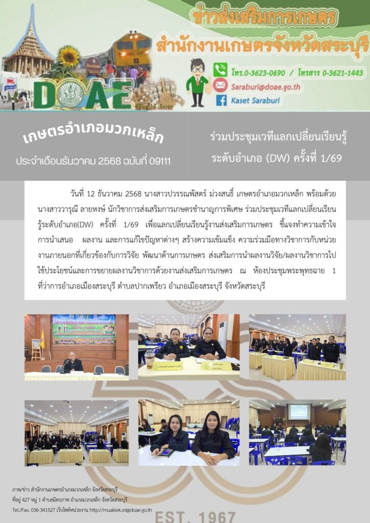 วันที่ 12 ธันวาคม 2568 นางสาวปวรรณพัสตร์ ม่วงสนธิ์ เกษตรอำเภอมวกเหล็ก พร้อมด้วย นางสาววารุณี ลายหงษ์ นักวิชาการส่งเสริมการเกษตรชำนาญการพิเศษ ร่วมประชุมเวทีแลกเปลี่ยนเรียนรู้ระดับอำเภอ(DW) ครั้งที่ 1/69 เพื่อแลกเปลี่ยนเรียนรู้งานส่งเสริมการเกษตร ชี้แจงทำความเข้าใจ การนำเสนอ ผลงาน และการแก้ไขปัญหาต่างๆ สร้างความเข้มแข็ง ความร่วมมือทางวิชาการกับหน่วยงานภายนอกที่เกี่ยวข้องกับการวิจัย พัฒนาด้านการเกษตร ส่งเสริมการนำผลงานวิจัย/ผลงานวิชาการไปใช้ประโยชน์และการขยายผลงานวิชาการด้วยงานส่งเสริมการเกษตร ณ ห้องประชุมพระพุทธฉาย 1 ที่ว่าการอำเภอเมืองสระบุรี ตำบลปากเพรียว อำเภอเมืองสระบุรี จังหวัดสระบุรี