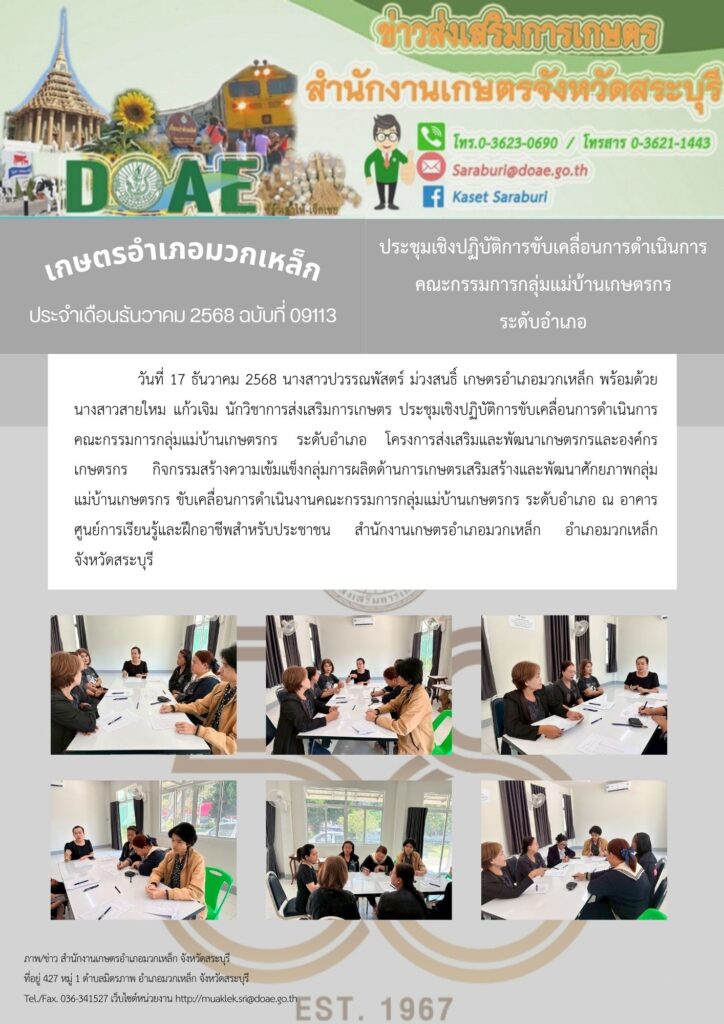 วันที่ 17 ธันวาคม 2568 นางสาวปวรรณพัสตร์ ม่วงสนธิ์ เกษตรอำเภอมวกเหล็ก พร้อมด้วย นางสาวสายใหม แก้วเจิม นักวิชาการส่งเสริมการเกษตร ประชุมเชิงปฏิบัติการขับเคลื่อนการดำเนินการคณะกรรมการกลุ่มแม่บ้านเกษตรกร ระดับอำเภอ โครงการส่งเสริมและพัฒนาเกษตรกรและองค์กรเกษตรกร กิจกรรมสร้างความเข้มแข็งกลุ่มการผลิตด้านการเกษตรเสริมสร้างและพัฒนาศักยภาพกลุ่ม แม่บ้านเกษตรกร ขับเคลื่อนการดำเนินงานคณะกรรมการกลุ่มแม่บ้านเกษตรกร ระดับอำเภอ ณ อาคารศูนย์การเรียนรู้และฝึกอาชีพสำหรับประชาชน สำนักงานเกษตรอำเภอมวกเหล็ก อำเภอมวกเหล็ก จังหวัดสระบุรี